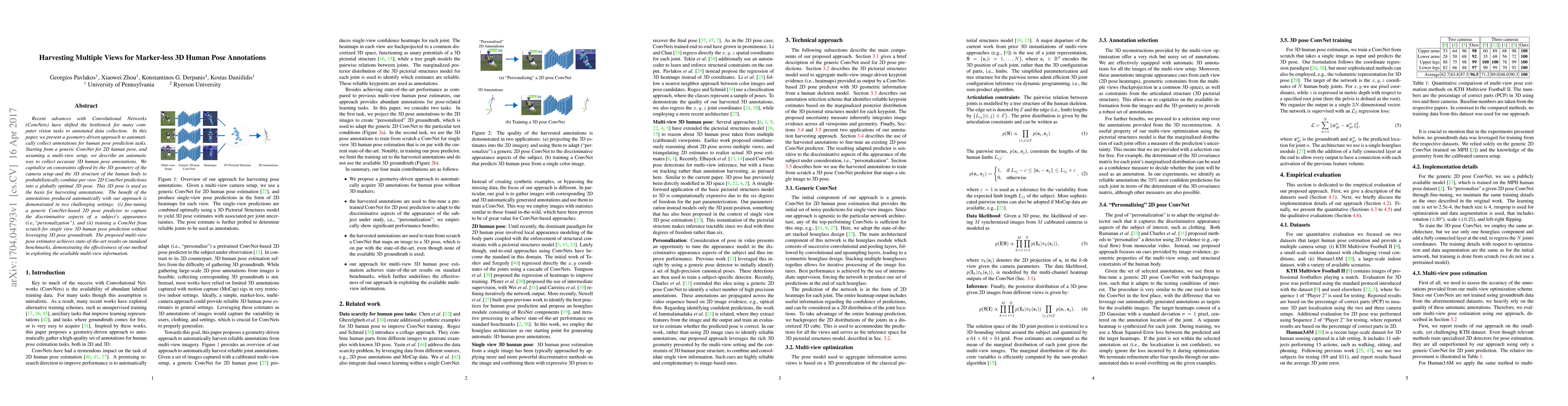 A new approach automatically collects 3D human pose annotations from multiple camera views using Convolutional Networks, achieving state-of-the-art results in benchmark tests.