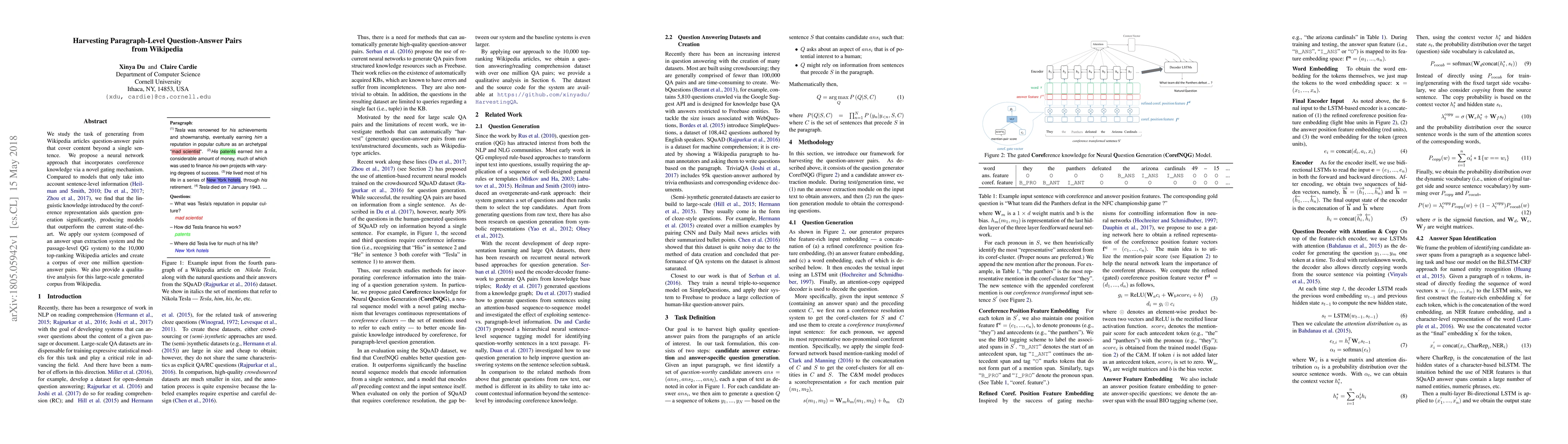 This paper proposes a neural network for generating paragraph-level question-answer pairs from Wikipedia, incorporating coreference knowledge to improve performance over sentence-level models. The approach creates a corpus of over one million pairs from top Wikipedia articles and demonstrates significant improvements over existing methods.