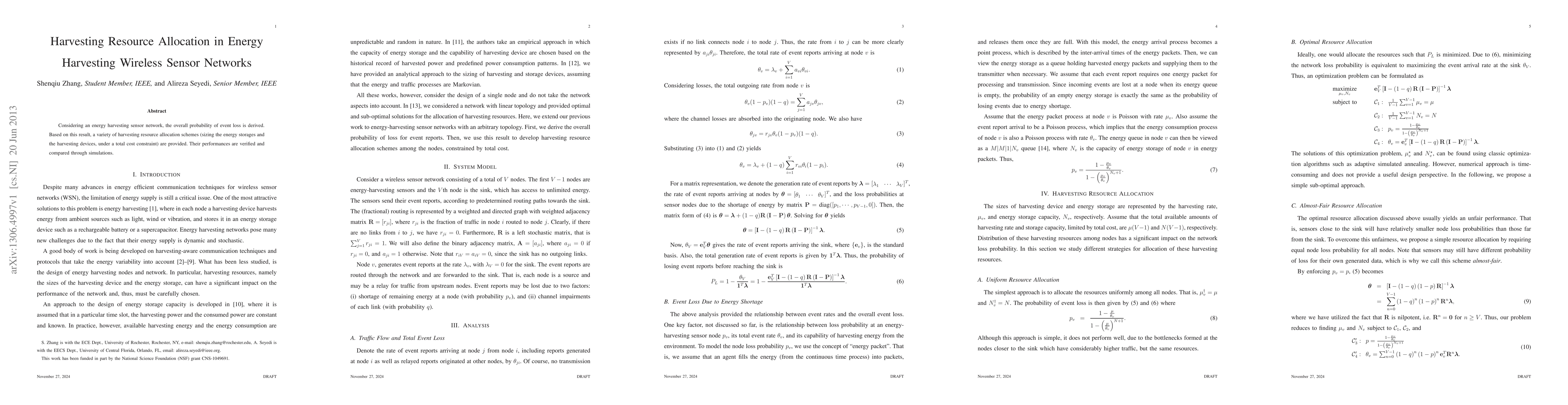 Considering an energy harvesting sensor network, the overall probability of event loss is derived. Based on this result, a variety of harvesting resource allocation schemes (sizing the energy storages and the harvesting devices, under a total cost constraint) are provided. Their performances are verified and compared through simulations.