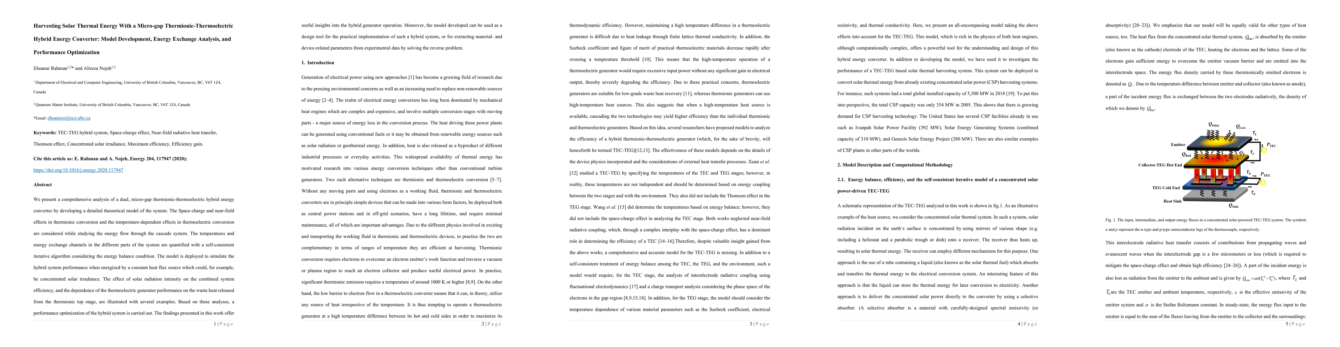 This paper develops a theoretical model for a micro-gap thermionic-thermoelectric hybrid energy converter, analyzing its performance under concentrated solar irradiance. The study optimizes the system's efficiency by considering space-charge and near-field effects, and provides a design tool for practical implementation.