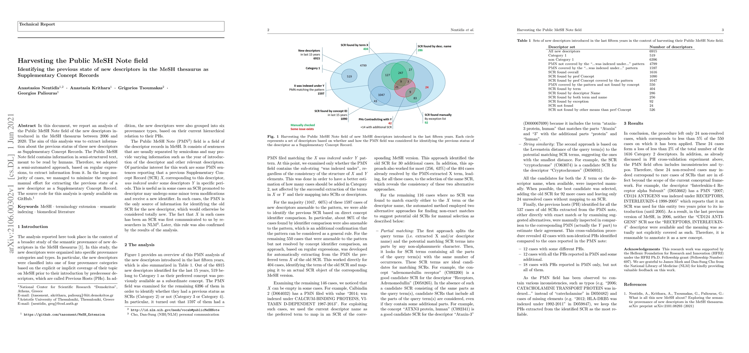 Researchers analyzed the Public MeSH Note field to extract information about new descriptors introduced between 2006 and 2020, finding that most were previously marked as Supplementary Concept Records with minimal manual effort required for extraction.