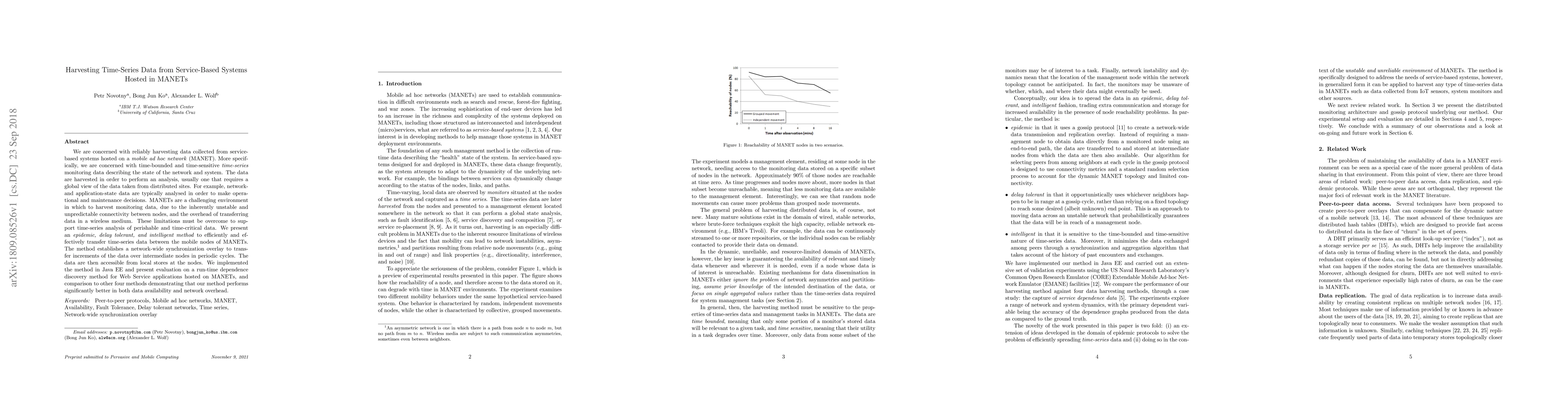 We are concerned with reliably harvesting data collected from service-based systems hosted on a mobile ad hoc network (MANET). More specifically, we are concerned with time-bounded and time-sensitive time-series monitoring data describing the state of the network and system. The data are harvested in order to perform an analysis, usually one that requires a global view of the data taken from distributed sites. For example, network- and application-state data are typically analysed in order to make operational and maintenance decisions. MANETs are a challenging environment in which to harvest monitoring data, due to the inherently unstable and unpredictable connectivity between nodes, and the overhead of transferring data in a wireless medium. These limitations must be overcome to support time-series analysis of perishable and time-critical data. We present an epidemic, delay tolerant, and intelligent method to efficiently and effectively transfer time-series data between the mobile nodes of MANETs. The method establishes a network-wide synchronization overlay to transfer increments of the data over intermediate nodes in periodic cycles. The data are then accessible from local stores at the nodes. We implemented the method in Java~EE and present evaluation on a run-time dependence discovery method for Web Service applications hosted on MANETs, and comparison to other four methods demonstrating that our method performs significantly better in both data availability and network overhead.