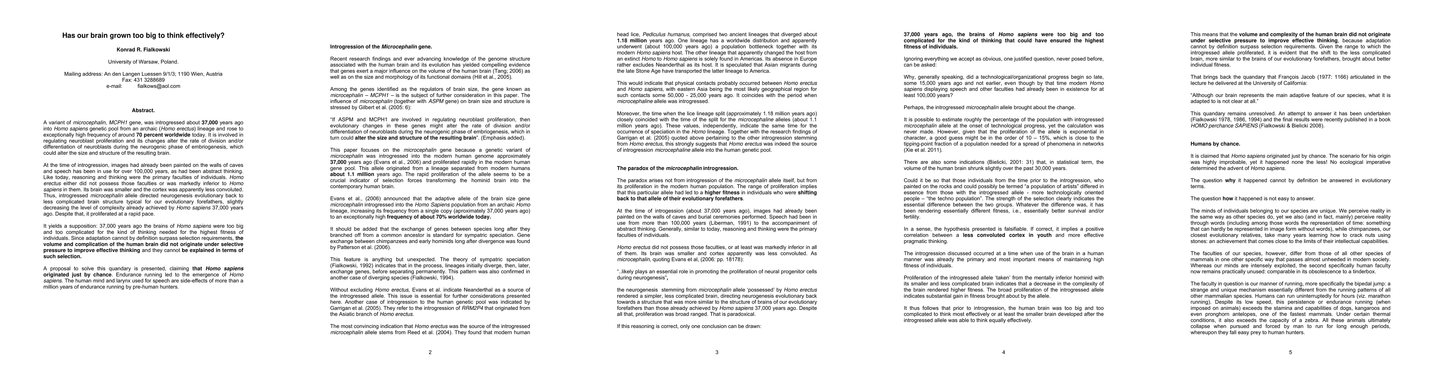 A variant of microcephalin, MCPH1 gene, was introgressed about 37,000 years ago into Homo sapiens genetic pool from an archaic (Homo erectus) lineage and rose to exceptionally high frequency of around 70 percent worldwide today. It is involved in regulating neuroblast proliferation and its changes alter the rate of division and/or differentiation of neuroblasts during the neurogenic phase of embriogenesis, which could alter the size and structure of the resulting brain. At the time of introgression, images had already been painted on the walls of caves and speech has been in use for over 100,000 years, as had been abstract thinking. Like today, reasoning and thinking were the primary faculties of individuals. Homo erectus either did not possess those faculties or was markedly inferior to Homo sapiens in them. Its brain was smaller and the cortex was apparently less convoluted. Thus, introgressed microcephalin allele directed neurogenesis evolutionary back to less complicated brain structure typical for our evolutionary forefathers, slightly decreasing the level of complexity already achieved by Homo sapiens 37,000 years ago. Despite that, it proliferated at a rapid pace. It yields a supposition: 37,000 years ago the brains of Homo sapiens were too big and too complicated for the kind of thinking needed for the highest fitness of individuals. Since adaptation cannot by definition surpass selection requirements, the volume and complication of the human brain did not originate under selective pressure to improve effective thinking and they cannot be explained in terms of such selection. A proposal to solve this quandary is presented, claiming that Homo sapiens originated just by chance. Endurance running led to the emergence of Homo sapiens. The human mind and larynx used for speech are side-effects of more than a million years of endurance running by pre-human hunters.