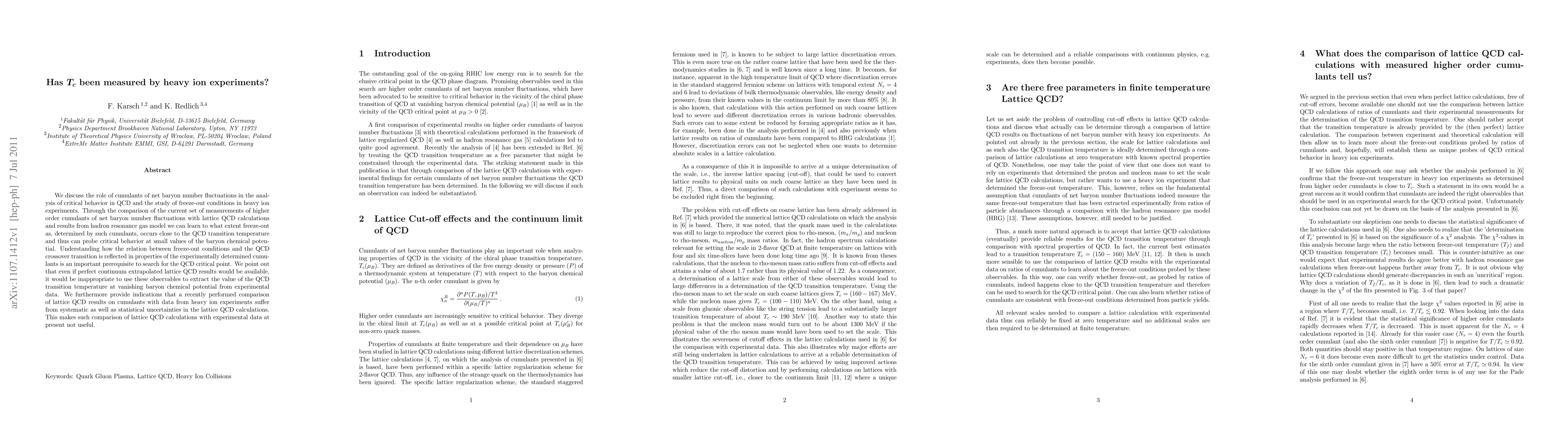 The paper discusses the use of cumulants of net baryon number fluctuations in heavy ion experiments to understand QCD critical behavior and freeze-out conditions. It highlights that current experimental data and lattice QCD calculations are not precise enough for determining the QCD transition temperature at zero baryon chemical potential, and warns against using such comparisons to extract this value due to systematic and statistical uncertainties in lattice QCD computations.