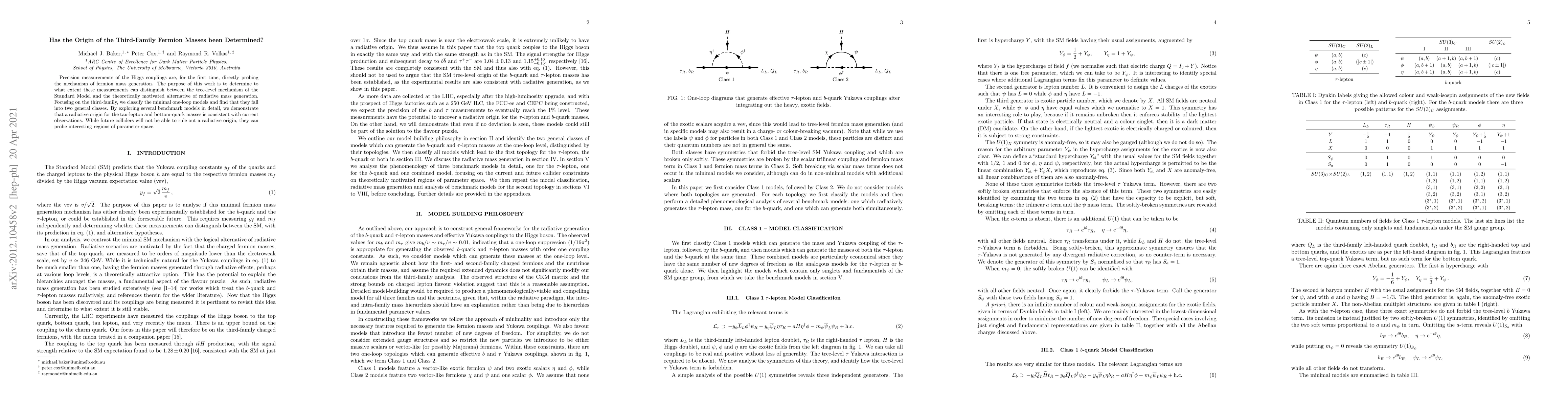 This paper investigates the potential for precision measurements of Higgs couplings to distinguish between the Standard Model's tree-level mechanism and alternative radiative mass generation for third-family fermions. It finds that while current observations allow for a radiative origin for the tau-lepton and bottom-quark masses, future colliders may explore relevant parameter spaces but cannot definitively rule out this alternative.