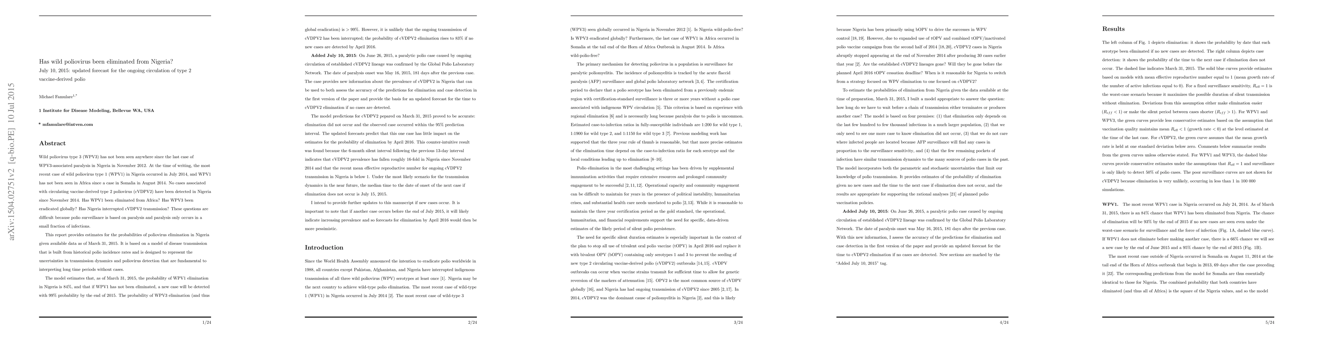 Wild poliovirus type 3 (WPV3) has not been seen anywhere since the last case of WPV3-associated paralysis in Nigeria in November 2012. At the time of writing, the most recent case of wild poliovirus type 1 (WPV1) in Nigeria occurred in July 2014, and WPV1 has not been seen in Africa since a case in Somalia in August 2014. No cases associated with circulating vaccine-derived type 2 poliovirus (cVDPV2) have been detected in Nigeria since November 2014. Has WPV1 been eliminated from Africa? Has WPV3 been eradicated globally? Has Nigeria interrupted cVDPV2 transmission? These questions are difficult because polio surveillance is based on paralysis and paralysis only occurs in a small fraction of infections. This report provides estimates for the probabilities of poliovirus elimination in Nigeria given available data as of March 31, 2015. It is based on a model of disease transmission that is built from historical polio incidence rates and is designed to represent the uncertainties in transmission dynamics and poliovirus detection that are fundamental to interpreting long time periods without cases. The model estimates that, as of March 31, 2015, the probability of WPV1 elimination in Nigeria is 84%, and that if WPV1 has not been eliminated, a new case will be detected with 99% probability by the end of 2015. The probability of WPV3 elimination (and thus global eradication) is >99%. However, it is unlikely that the ongoing transmission of cVDPV2 has been interrupted; the probability of cVDPV2 elimination rises to 83% if no new cases are detected by April 2016. Added July 10, 2015: On June 26, a cVDPV2 case was confirmed by the Global Polio Laboratory Network. The date of paralysis was May 16. The case provides new information about cVDPV2 prevalence that is useful for assessing the accuracy of previous predictions and informing an updated forecast for the time to cVDPV2 elimination.