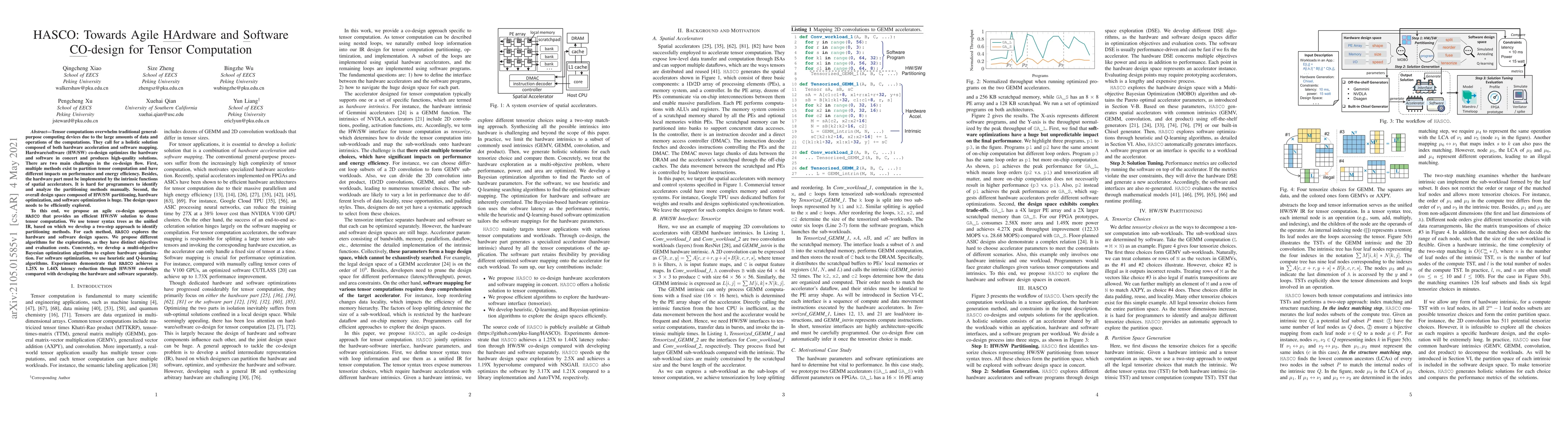 HASCO proposes an agile co-design approach for optimizing hardware and software in tensor computations, addressing challenges in partitioning and design space exploration, achieving significant latency reductions through joint optimization.