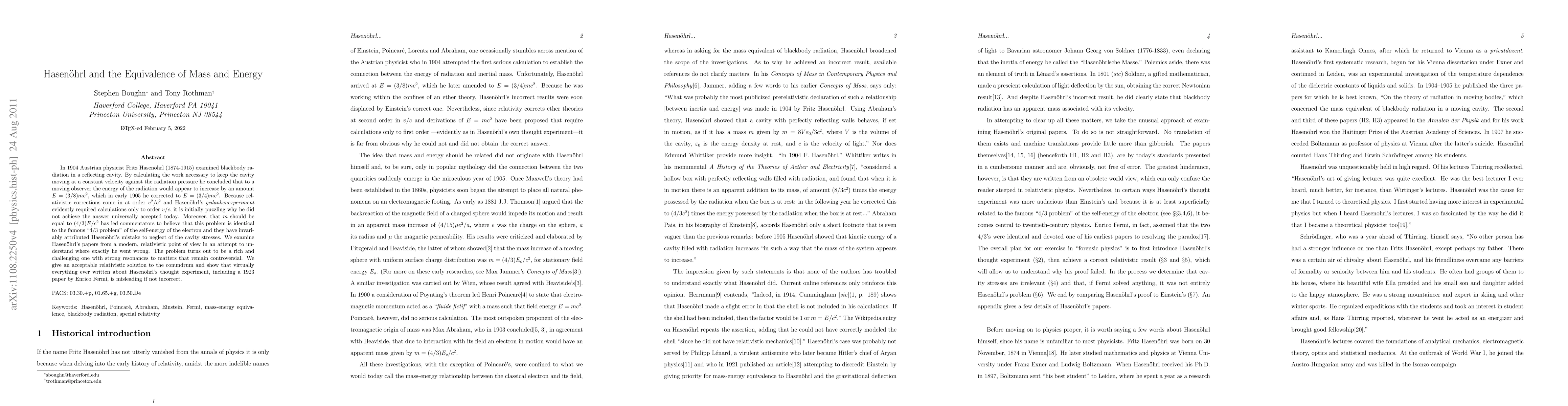 Fritz Hasenohrl's 1904 analysis of blackbody radiation in a moving cavity led to an early formulation of mass-energy equivalence, though he miscalculated the energy increase. A modern relativistic review reveals that his error stemmed from insufficient consideration of cavity stresses, challenging conventional interpretations and highlighting ongoing debates in the field.