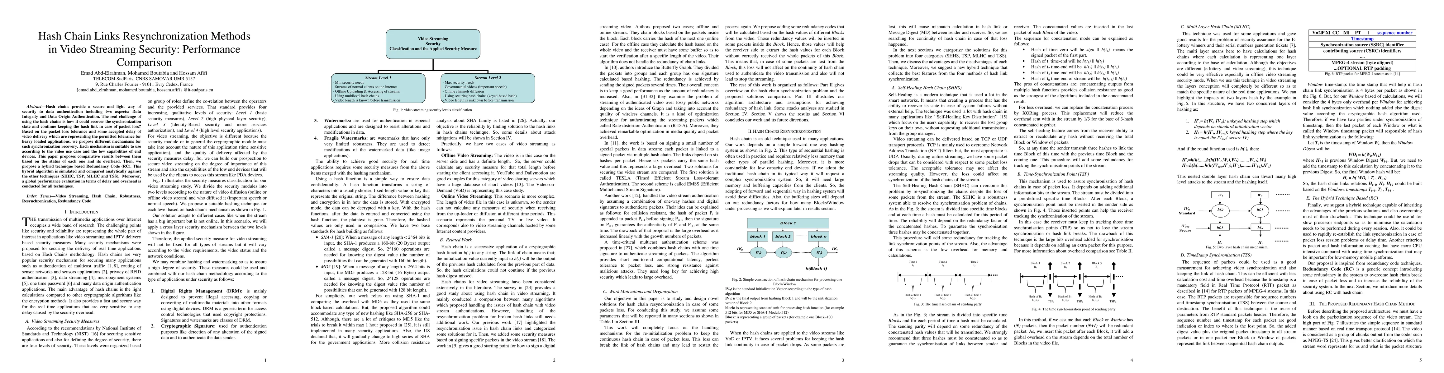 Hash chains provide a secure and light way of security to data authentication including two aspects: Data Integrity and Data Origin Authentication. The real challenge of using the hash chains is how it could recover the synchronization state and continue keeping the hash link in case of packet loss? Based on the packet loss tolerance and some accepted delay of video delivery which are representing the permitted tolerance for heavy loaded applications, we propose different mechanisms for such synchronization recovery. Each mechanism is suitable to use according to the video use case and the low capabilities of end devices. This paper proposes comparative results between them based on the status of each one and its overhead. Then, we propose a hybrid technique based Redundancy Code (RC). This hybrid algorithm is simulated and compared analytically against the other techniques (SHHC, TSP, MLHC and TSS). Moreover, a global performance evaluation in terms of delay and overhead is conducted for all techniques.