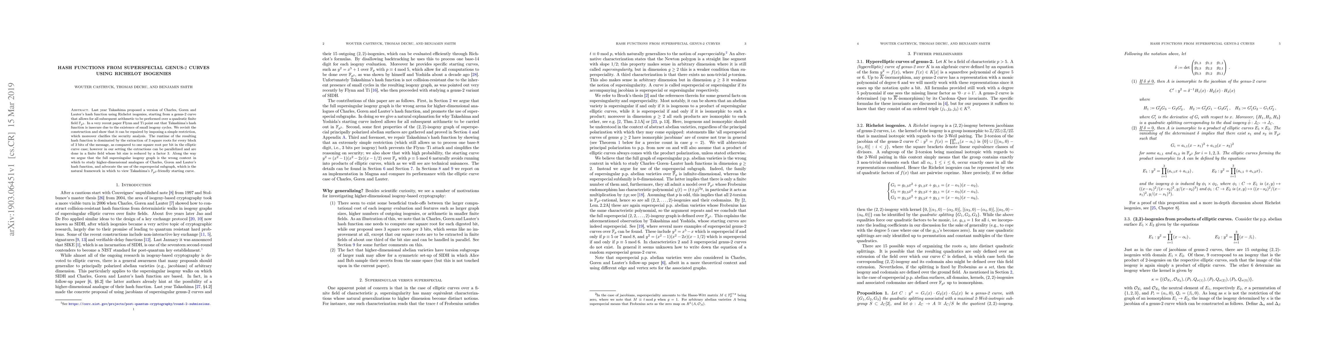 Last year Takashima proposed a version of Charles, Goren and Lauter's hash function using Richelot isogenies, starting from a genus-2 curve that allows for all subsequent arithmetic to be performed over a quadratic finite field Fp2. In a very recent paper Flynn and Ti point out that Takashima's hash function is insecure due to the existence of small isogeny cycles. We revisit the construction and show that it can be repaired by imposing a simple restriction, which moreover clarifies the security analysis. The runtime of the resulting hash function is dominated by the extraction of 3 square roots for every block of 3 bits of the message, as compared to one square root per bit in the elliptic curve case; however in our setting the extractions can be parallelized and are done in a finite field whose bit size is reduced by a factor 3. Along the way we argue that the full supersingular isogeny graph is the wrong context in which to study higher-dimensional analogues of Charles, Goren and Lauter's hash function, and advocate the use of the superspecial subgraph, which is the natural framework in which to view Takashima's Fp2-friendly starting curve.