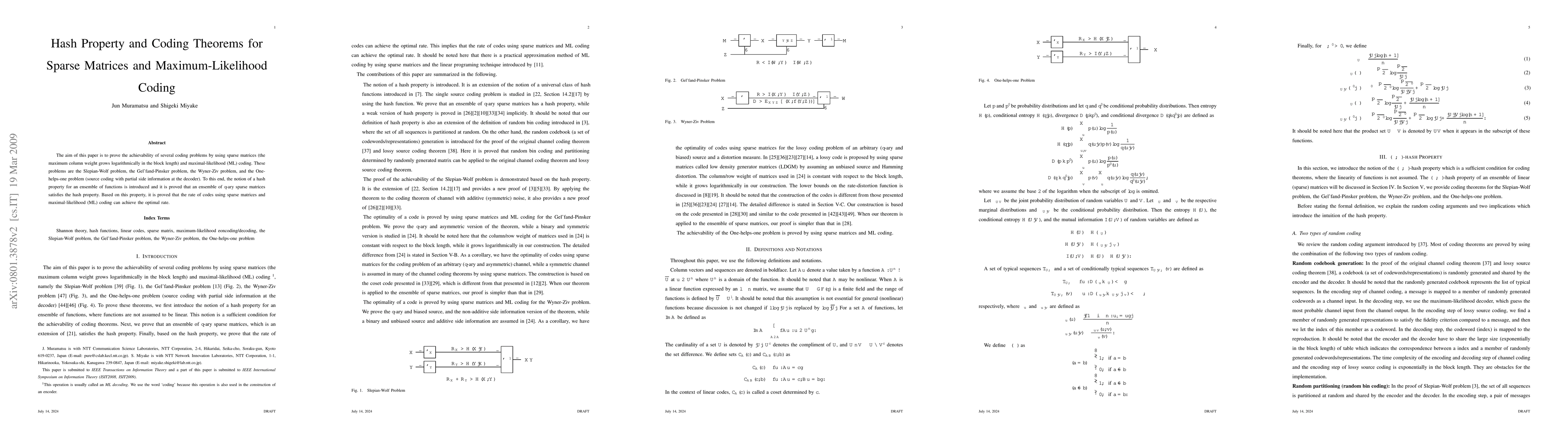 The aim of this paper is to prove the achievability of several coding problems by using sparse matrices (the maximum column weight grows logarithmically in the block length) and maximal-likelihood (ML) coding. These problems are the Slepian-Wolf problem, the Gel'fand-Pinsker problem, the Wyner-Ziv problem, and the One-helps-one problem (source coding with partial side information at the decoder). To this end, the notion of a hash property for an ensemble of functions is introduced and it is proved that an ensemble of $q$-ary sparse matrices satisfies the hash property. Based on this property, it is proved that the rate of codes using sparse matrices and maximal-likelihood (ML) coding can achieve the optimal rate.