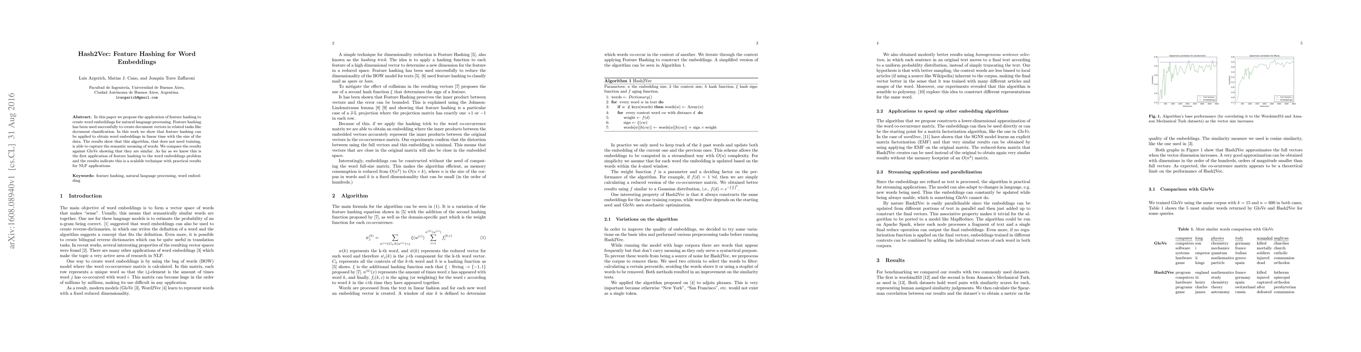 This paper introduces Hash2Vec, a method for creating word embeddings using feature hashing, demonstrating its ability to capture semantic meaning in linear time without training. The results are comparable to GloVe, indicating feature hashing as a scalable and practical solution for natural language processing tasks.