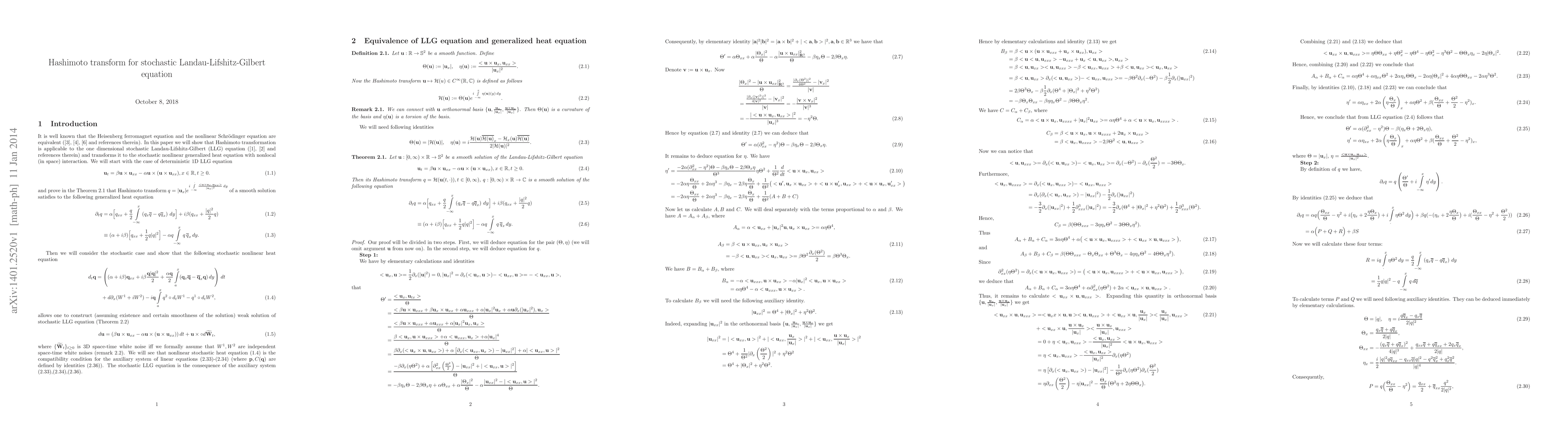 Summary: The paper demonstrates that the Hashimoto transformation can convert the one-dimensional stochastic Landau-Lifshitz-Gilbert equation into a stochastic generalized heat equation featuring nonlocal spatial interactions. This transformation provides a new perspective on the dynamics of the stochastic LLG equation.