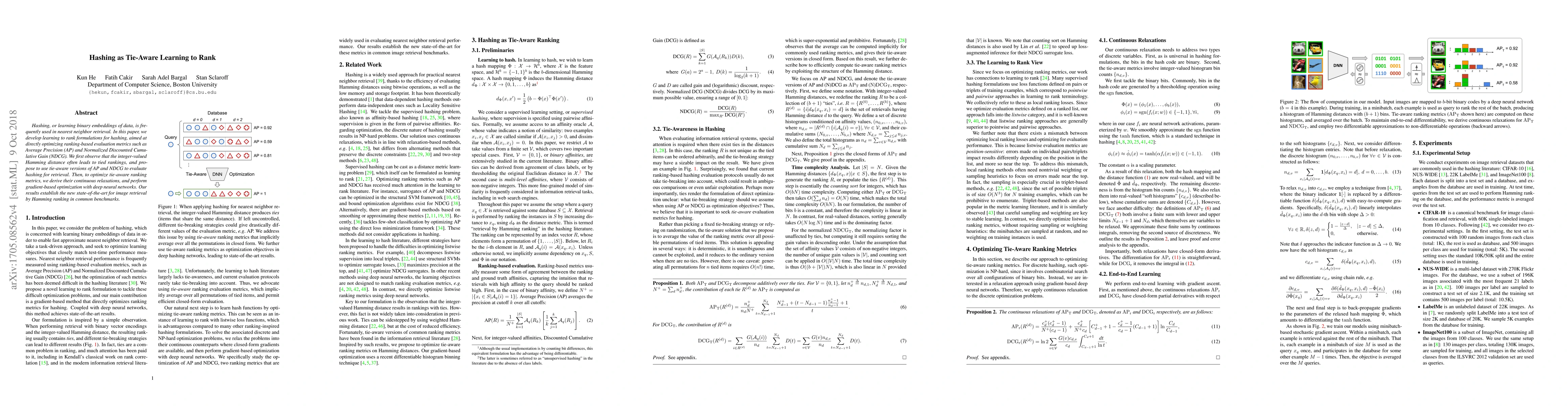 This paper develops a new approach to hashing for image retrieval, optimizing ranking-based metrics such as Average Precision and NDCG with tie-aware versions, leading to state-of-the-art results in common benchmarks.