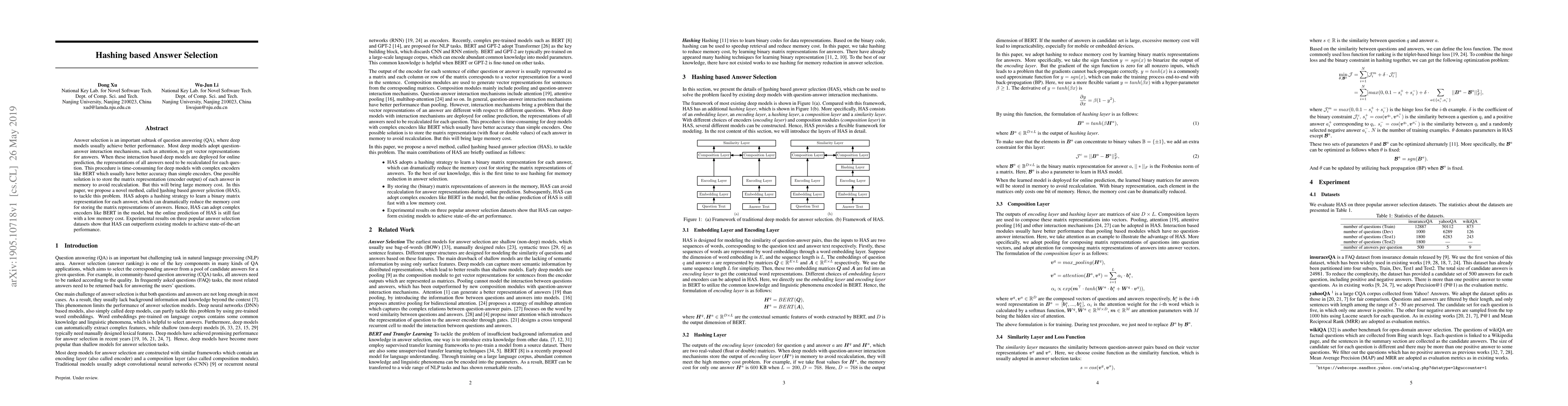 A new method called Hashing based Answer Selection (HAS) is proposed to reduce memory cost in question answering systems without sacrificing performance, outperforming existing models on popular datasets.