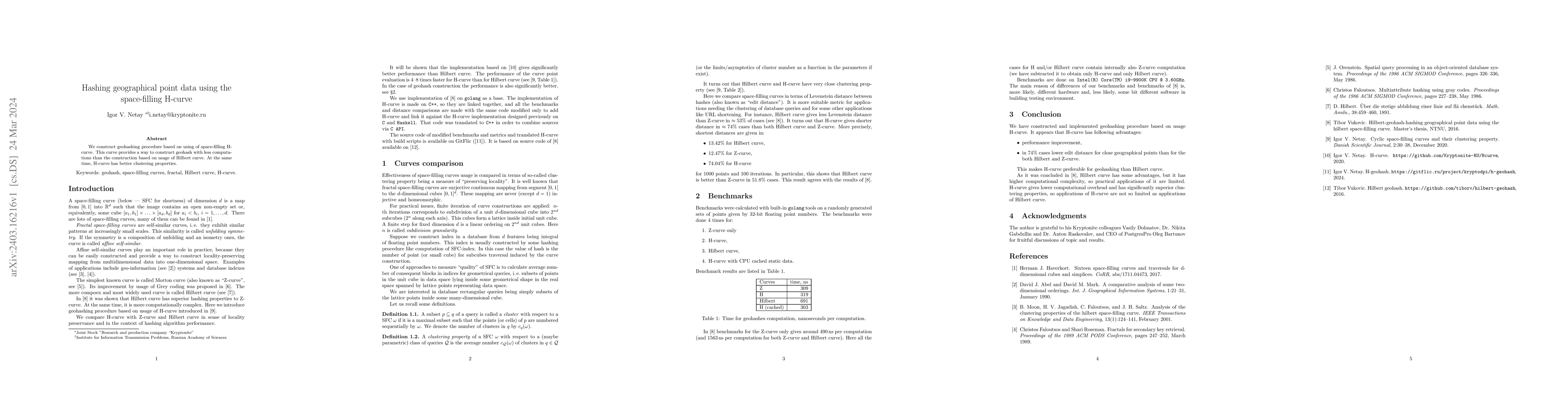 Summary: This paper proposes a geohashing method utilizing the space-filling H-curve, which requires fewer computational resources compared to Hilbert curve-based methods and offers superior clustering properties.