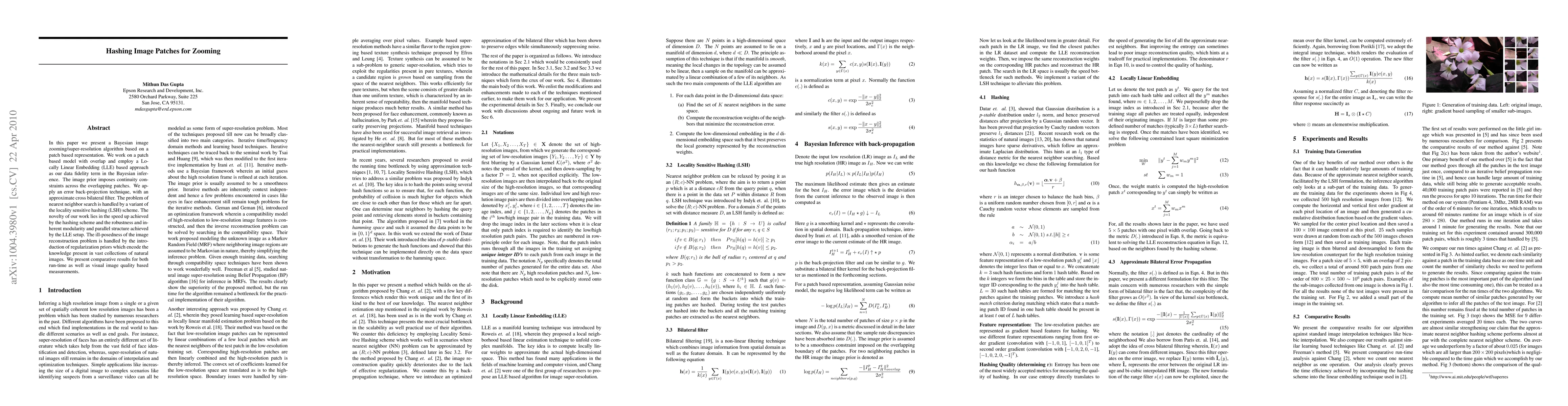 This paper proposes a Bayesian image zooming/super-resolution algorithm that uses patch-based representation and Locally Linear Embedding for robustness and speed. It achieves faster run-time and better image quality compared to existing methods.
