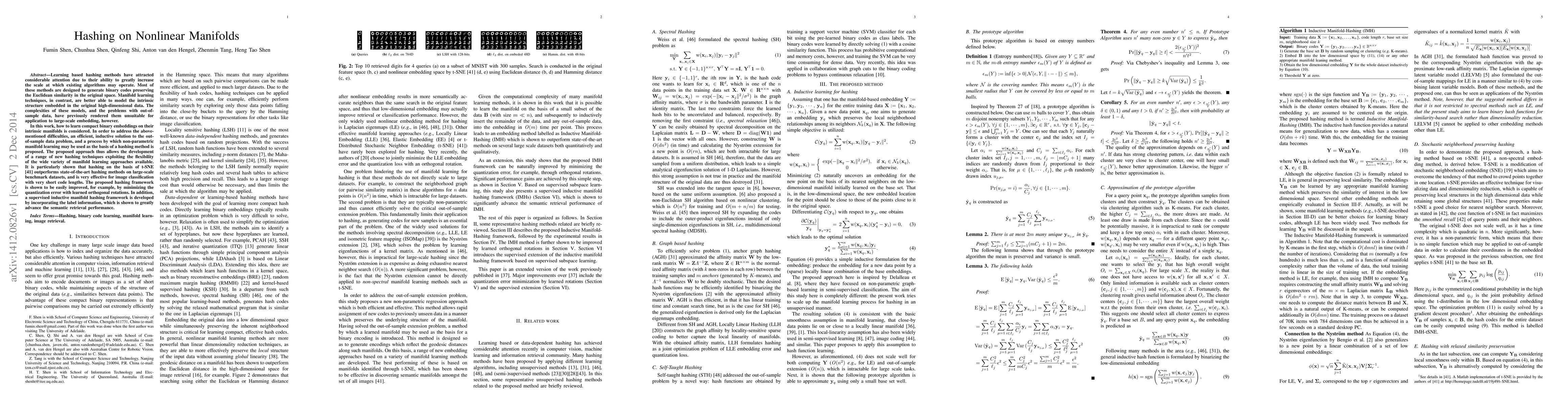 Learning based hashing methods have attracted considerable attention due to their ability to greatly increase the scale at which existing algorithms may operate. Most of these methods are designed to generate binary codes preserving the Euclidean similarity in the original space. Manifold learning techniques, in contrast, are better able to model the intrinsic structure embedded in the original high-dimensional data. The complexities of these models, and the problems with out-of-sample data, have previously rendered them unsuitable for application to large-scale embedding, however. In this work, how to learn compact binary embeddings on their intrinsic manifolds is considered. In order to address the above-mentioned difficulties, an efficient, inductive solution to the out-of-sample data problem, and a process by which non-parametric manifold learning may be used as the basis of a hashing method is proposed. The proposed approach thus allows the development of a range of new hashing techniques exploiting the flexibility of the wide variety of manifold learning approaches available. It is particularly shown that hashing on the basis of t-SNE outperforms state-of-the-art hashing methods on large-scale benchmark datasets, and is very effective for image classification with very short code lengths. The proposed hashing framework is shown to be easily improved, for example, by minimizing the quantization error with learned orthogonal rotations. In addition, a supervised inductive manifold hashing framework is developed by incorporating the label information, which is shown to greatly advance the semantic retrieval performance.