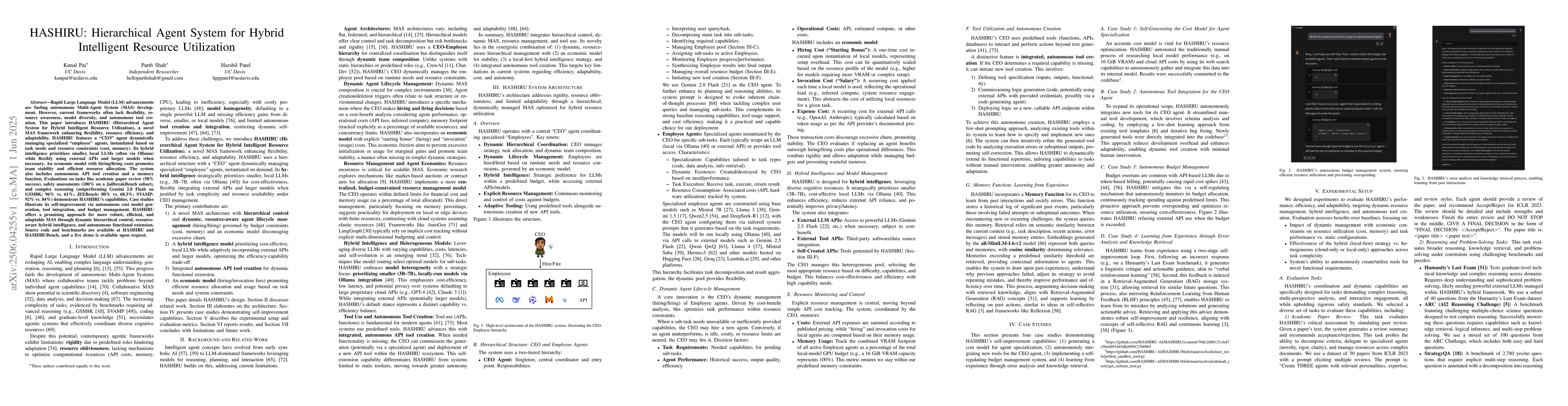 Rapid Large Language Model (LLM) advancements are fueling autonomous Multi-Agent System (MAS) development. However, current frameworks often lack flexibility, resource awareness, model diversity, and autonomous tool creation. This paper introduces HASHIRU (Hierarchical Agent System for Hybrid Intelligent Resource Utilization), a novel MAS framework enhancing flexibility, resource efficiency, and adaptability. HASHIRU features a "CEO" agent dynamically managing specialized "employee" agents, instantiated based on task needs and resource constraints (cost, memory). Its hybrid intelligence prioritizes smaller, local LLMs (via Ollama) while flexibly using external APIs and larger models when necessary. An economic model with hiring/firing costs promotes team stability and efficient resource allocation. The system also includes autonomous API tool creation and a memory function. Evaluations on tasks like academic paper review (58% success), safety assessments (100% on a JailbreakBench subset), and complex reasoning (outperforming Gemini 2.0 Flash on GSM8K: 96% vs. 61%; JEEBench: 80% vs. 68.3%; SVAMP: 92% vs. 84%) demonstrate HASHIRU's capabilities. Case studies illustrate its self-improvement via autonomous cost model generation, tool integration, and budget management. HASHIRU offers a promising approach for more robust, efficient, and adaptable MAS through dynamic hierarchical control, resource-aware hybrid intelligence, and autonomous functional extension. Source code and benchmarks are available at https://github.com/HASHIRU-AI/HASHIRU and https://github.com/HASHIRU-AI/HASHIRUBench respectively, and a live demo is available at https://hashiruagentx-hashiruai.hf.space upon request.