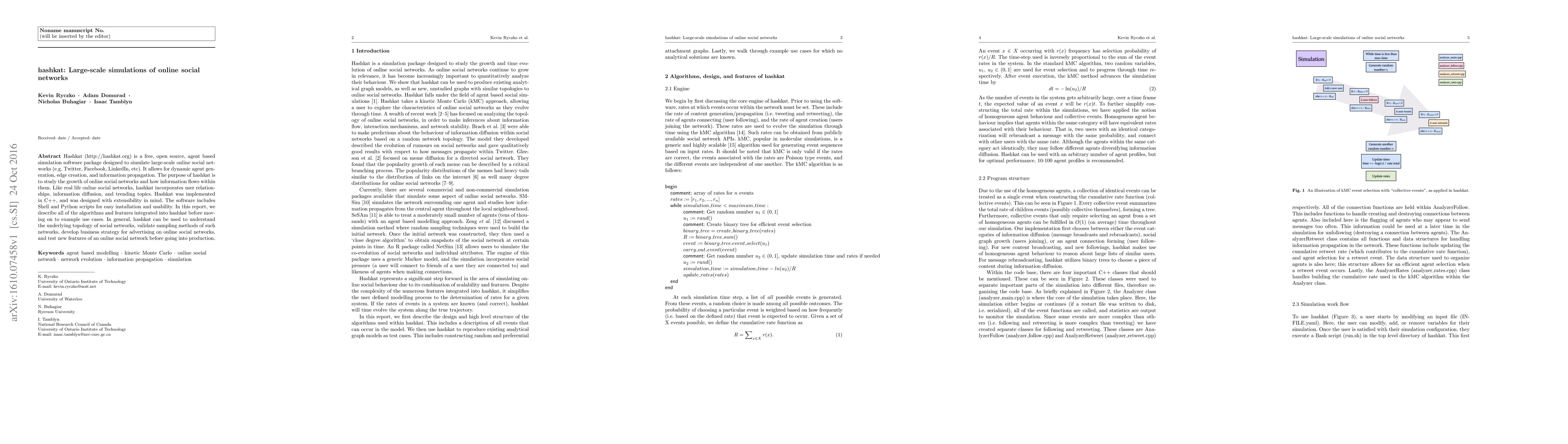 Hashkat is an open-source simulation software for modeling large-scale online social networks, enabling dynamic agent and information propagation studies. It can be used to analyze network growth, information diffusion, and validate sampling methods, aiding in business strategy development and feature testing.