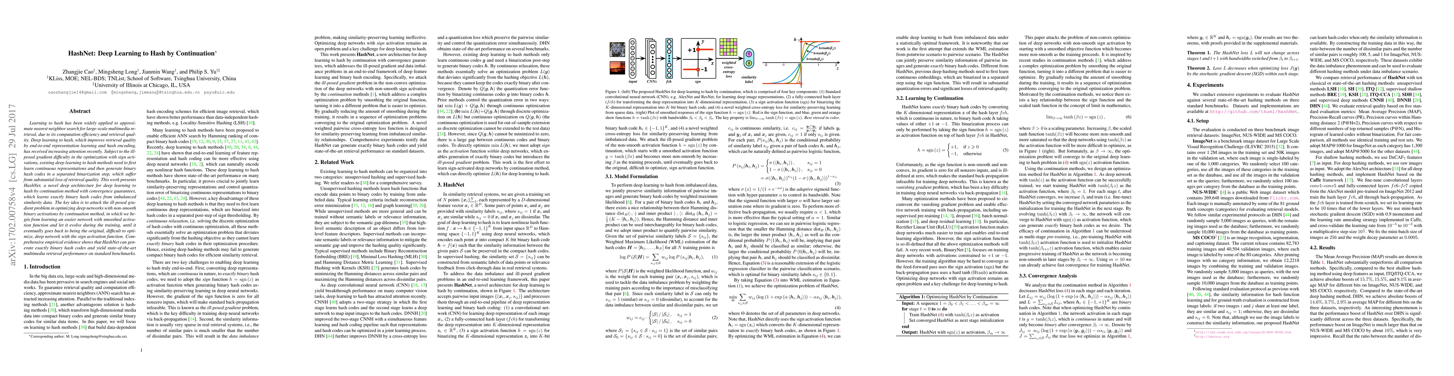 Learning to hash has been widely applied to approximate nearest neighbor search for large-scale multimedia retrieval, due to its computation efficiency and retrieval quality. Deep learning to hash, which improves retrieval quality by end-to-end representation learning and hash encoding, has received increasing attention recently. Subject to the ill-posed gradient difficulty in the optimization with sign activations, existing deep learning to hash methods need to first learn continuous representations and then generate binary hash codes in a separated binarization step, which suffer from substantial loss of retrieval quality. This work presents HashNet, a novel deep architecture for deep learning to hash by continuation method with convergence guarantees, which learns exactly binary hash codes from imbalanced similarity data. The key idea is to attack the ill-posed gradient problem in optimizing deep networks with non-smooth binary activations by continuation method, in which we begin from learning an easier network with smoothed activation function and let it evolve during the training, until it eventually goes back to being the original, difficult to optimize, deep network with the sign activation function. Comprehensive empirical evidence shows that HashNet can generate exactly binary hash codes and yield state-of-the-art multimedia retrieval performance on standard benchmarks.