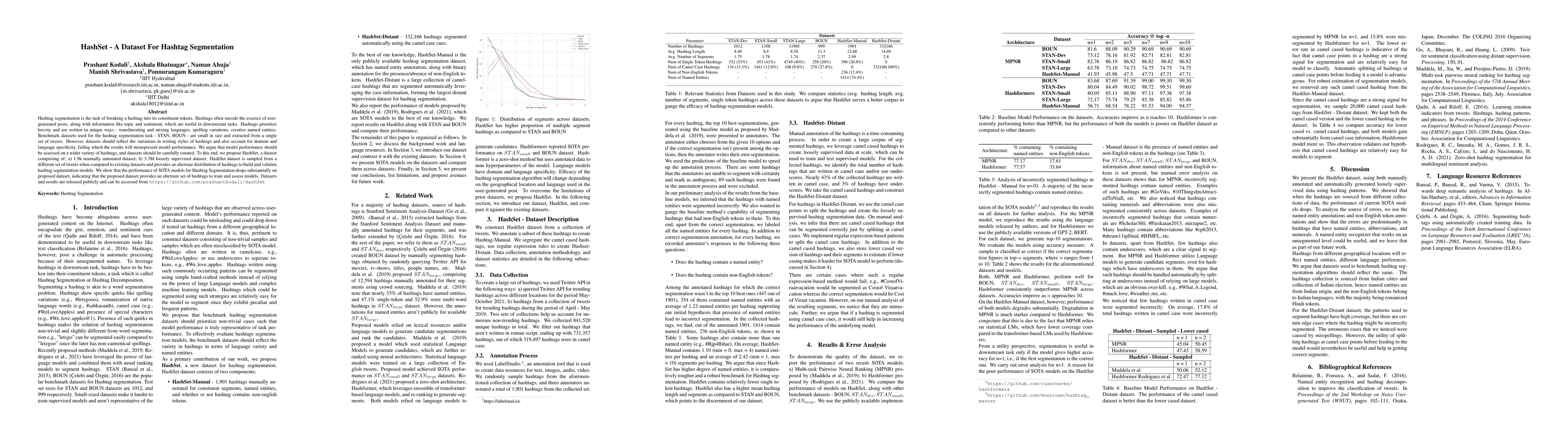 The paper proposes HashSet, a new dataset for hashtag segmentation, comprising 1.9k manually annotated and 3.3M loosely supervised entries, sampled from different tweets to better reflect variations in hashtag writing styles. The study shows that state-of-the-art models perform poorly on this dataset, indicating its value for training and evaluating hashtag segmentation models.