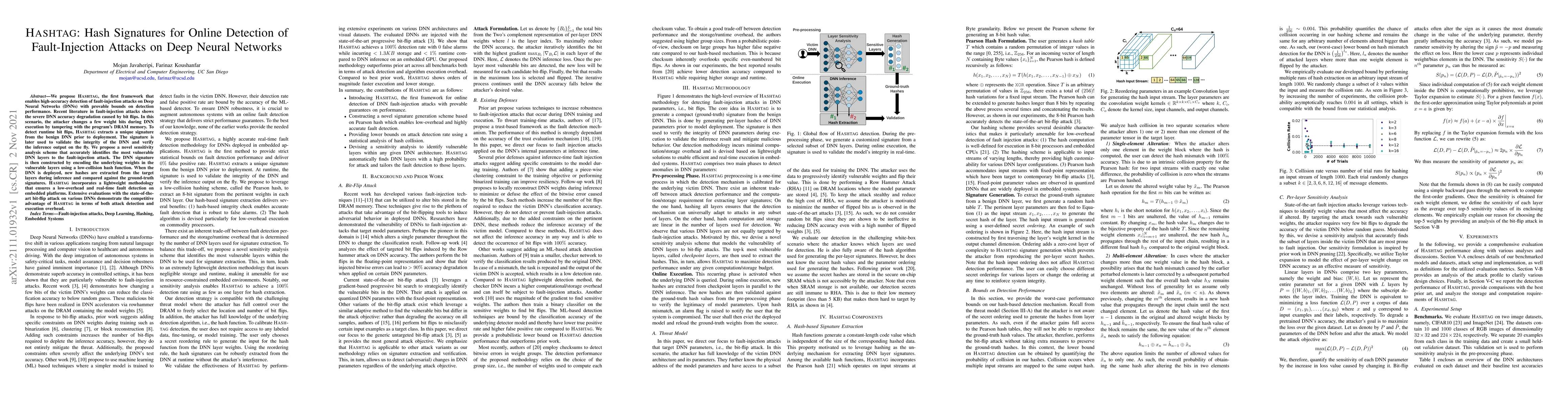 HASHTAG is a novel framework for detecting fault-injection attacks on Deep Neural Networks by creating a unique signature from vulnerable layers, which is then used to verify DNN integrity during inference. It demonstrates high accuracy and low-overhead detection, outperforming state-of-the-art methods.