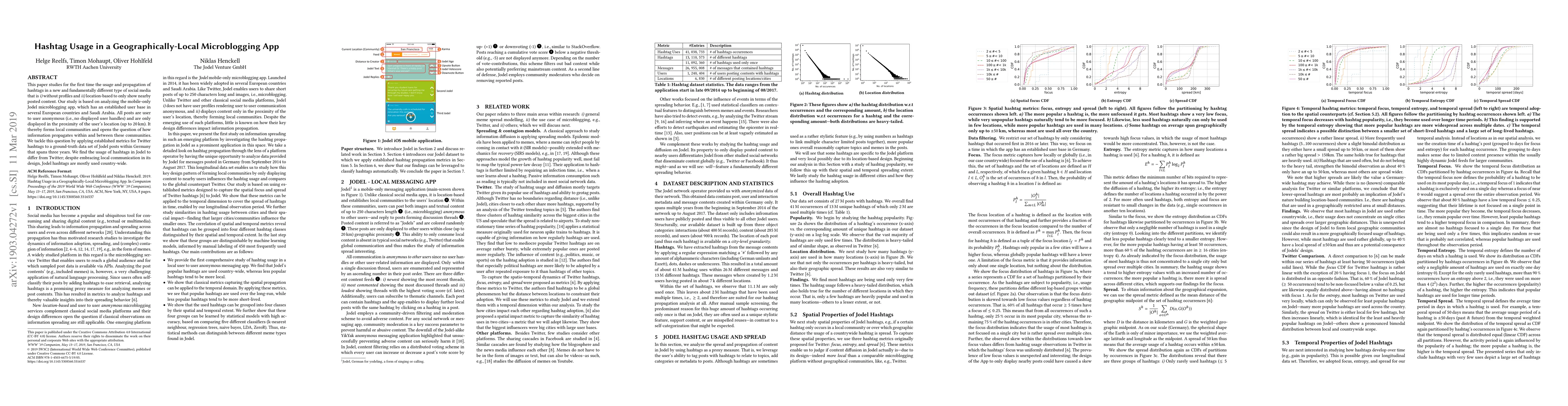 This paper studies for the first time the usage and propagation of hashtags in a new and fundamentally different type of social media that is i) without profiles and ii) location-based to only show nearby posted content. Our study is based on analyzing the mobile-only Jodel microblogging app, which has an established user base in several European countries and Saudi Arabia. All posts are user to user anonymous (i.e., no displayed user handles) and are only displayed in the proximity of the user's location (up to 20 km). It thereby forms local communities and opens the question of how information propagates within and between these communities. We tackle this question by applying established metrics for Twitter hashtags to a ground-truth data set of Jodel posts within Germany that spans three years. We find the usage of hashtags in Jodel to differ from Twitter; despite embracing local communication in its design, Jodel hashtags are mostly used country-wide.