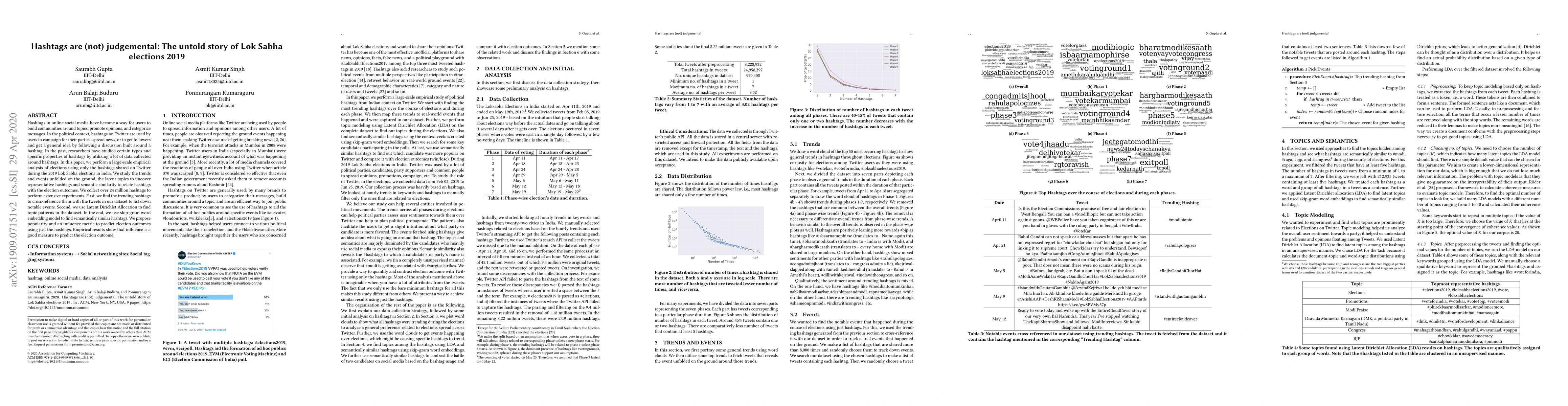 This paper conducts a large-scale analysis of Twitter hashtags during the 2019 Lok Sabha elections in India, employing over 24 million hashtags to study trends, latent topics, and semantic similarities. The study finds that an influence metric derived from hashtags is effective in predicting election outcomes.