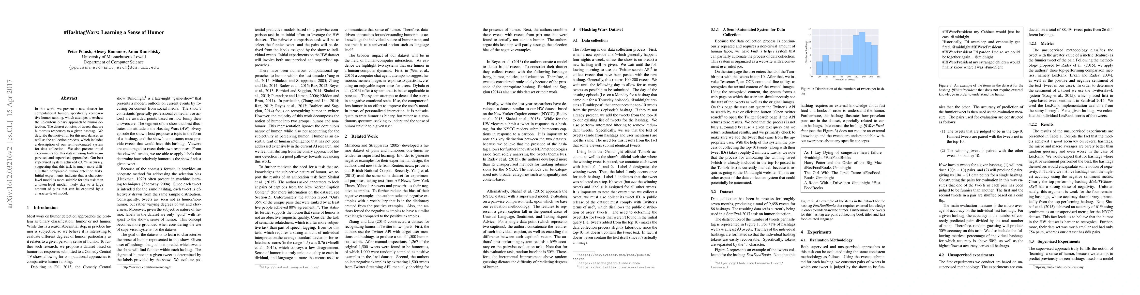 In this work, we present a new dataset for computational humor, specifically comparative humor ranking, which attempts to eschew the ubiquitous binary approach to humor detection. The dataset consists of tweets that are humorous responses to a given hashtag. We describe the motivation for this new dataset, as well as the collection process, which includes a description of our semi-automated system for data collection. We also present initial experiments for this dataset using both unsupervised and supervised approaches. Our best supervised system achieved 63.7% accuracy, suggesting that this task is much more difficult than comparable humor detection tasks. Initial experiments indicate that a character-level model is more suitable for this task than a token-level model, likely due to a large amount of puns that can be captured by a character-level model.
