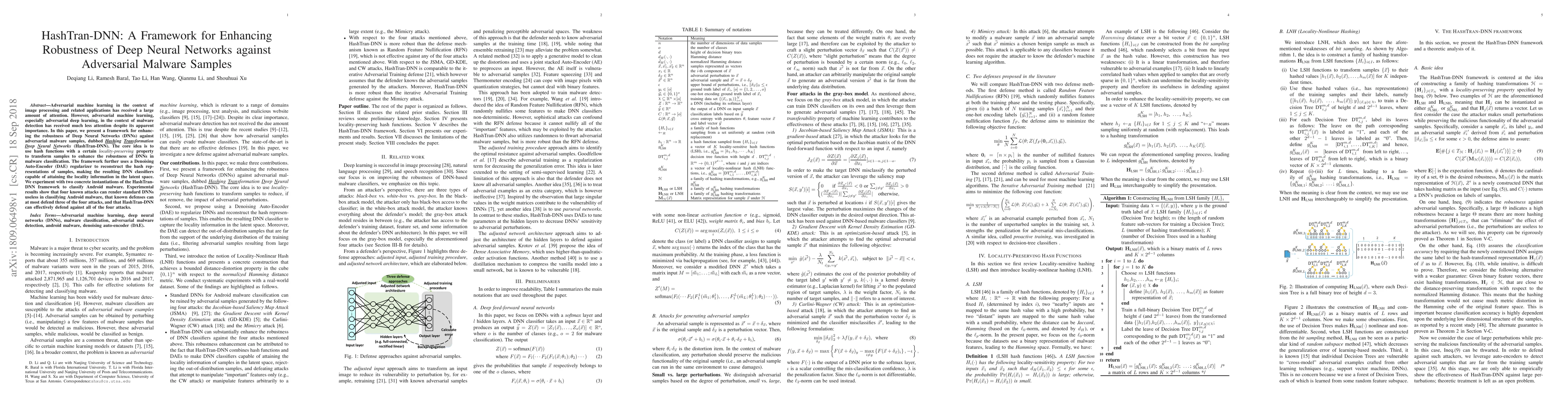 HashTran-DNN enhances DNN robustness against adversarial malware by using locality-preserving hash functions and Denoising Auto-Encoders. Experimental results demonstrate its effectiveness in defending against four known attacks, outperforming standard DNNs and existing defenses.