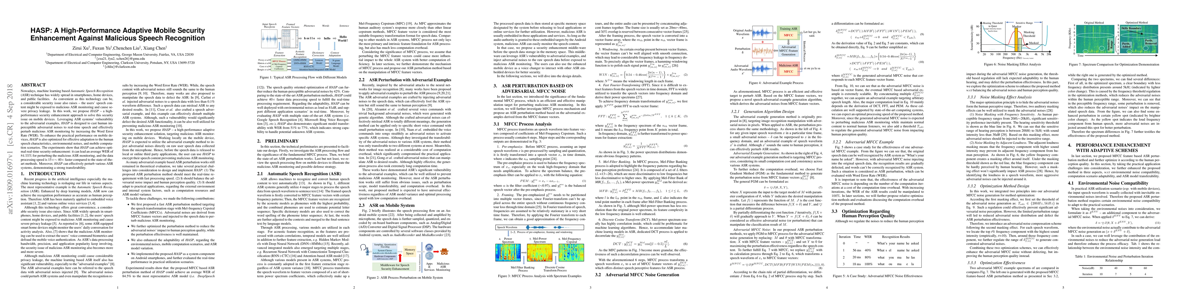 HASP is a high-performance adaptive mobile security enhancement designed to protect users' speech from malicious Automatic Speech Recognition (ASR) monitoring. It employs adversarial noise to perturb ASR systems, achieving an average 84.55% Word Error Rate (WER) while processing data 15x to 40x faster than existing methods.