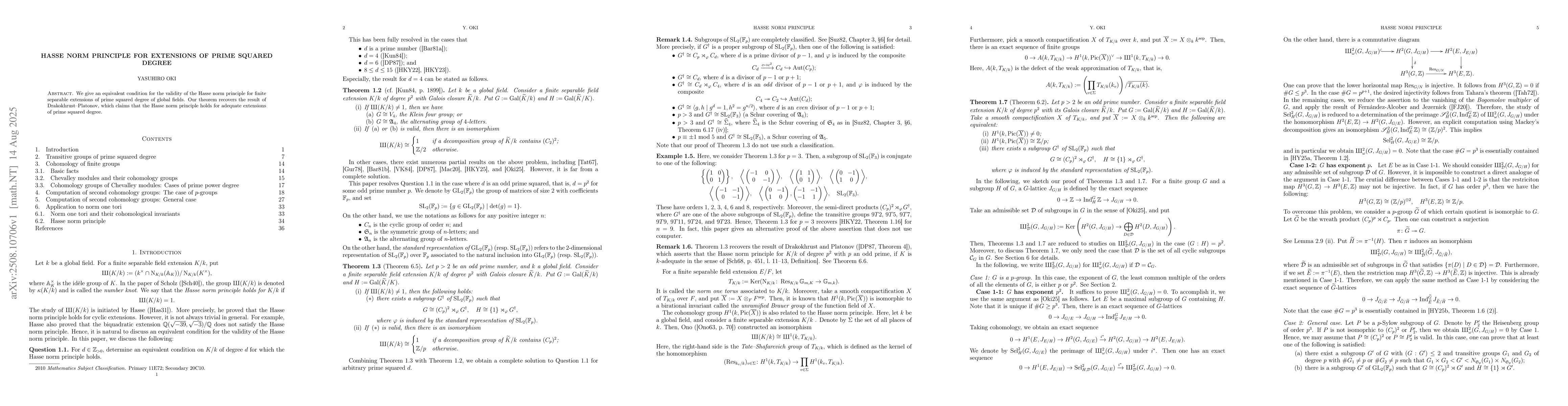 We give an equivalent condition for the validity of the Hasse norm principle for finite separable extensions of prime squared degree of global fields. Our theorem recovers the result of Drakokhrust--Platonov, which claims that the Hasse norm principle holds for adequate extensions of prime squared degree.