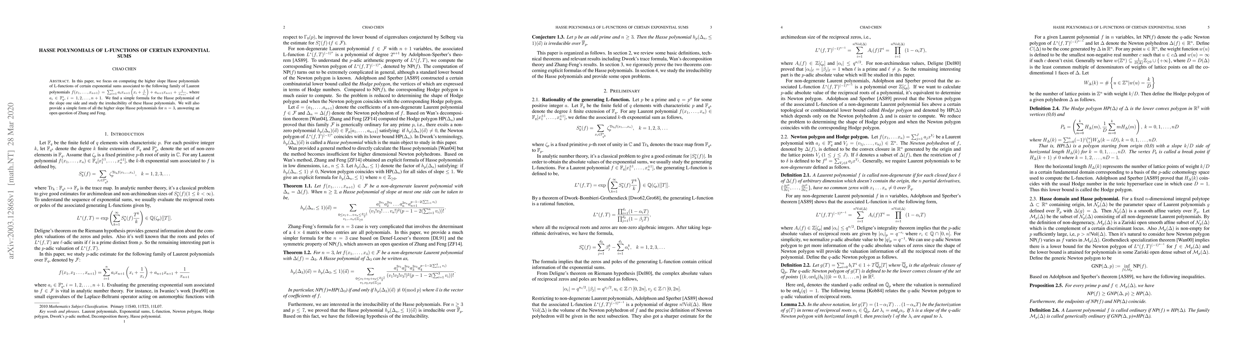 This paper computes the higher slope Hasse polynomials of L-functions for a specific family of exponential sums linked to Laurent polynomials. It provides a formula for the Hasse polynomial of the first slope and explores the irreducibility of these polynomials, while also offering a simple form for higher slope Hasse polynomials when $n=3$.