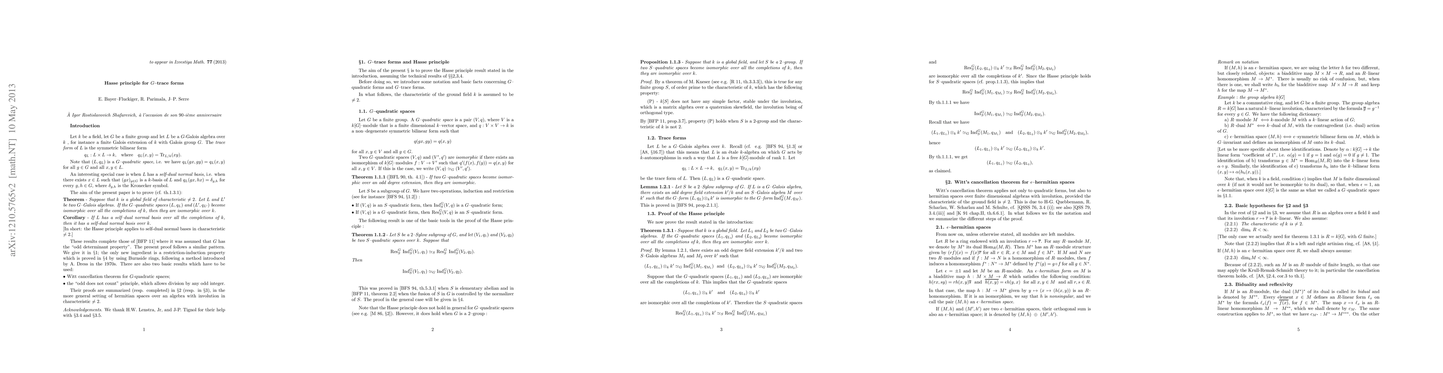 Summary: The paper proves a local-global principle for the existence of self-dual normal bases and the isomorphism of G-trace forms for G-Galois algebras over a global field of characteristic not 2. This addresses the Hasse principle in the context of algebraic number theory.