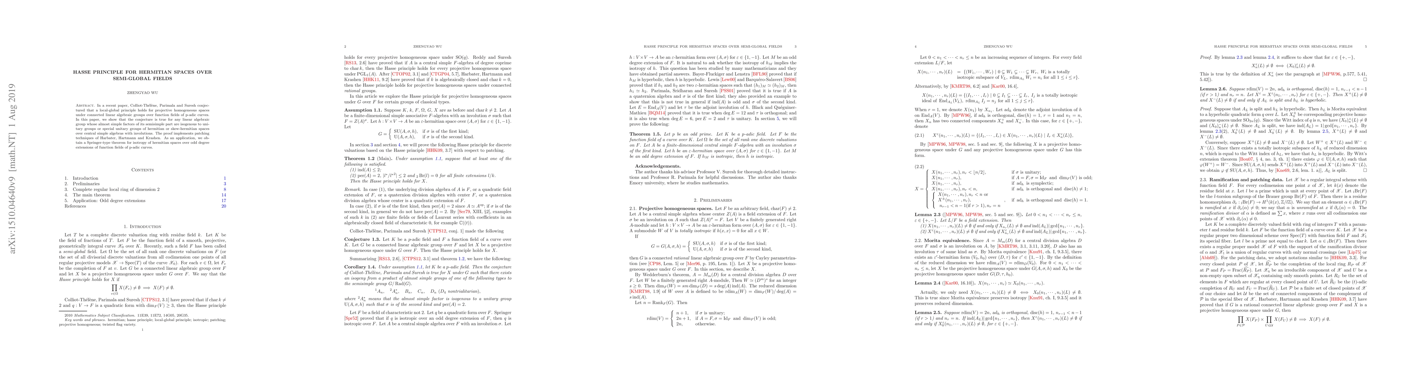 This paper confirms a conjecture regarding the Hasse principle for projective homogeneous spaces of linear algebraic groups over function fields of p-adic curves, specifically for groups whose semisimple parts are related to unitary or special unitary groups. The proof utilizes advanced patching techniques, leading to a Springer-type theorem on the isotropy of hermitian forms in odd degree extensions.