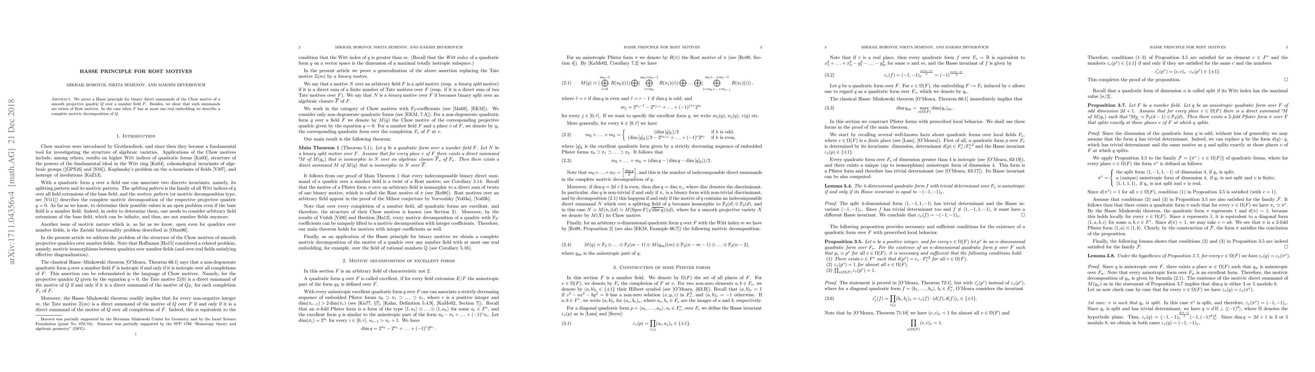 The paper establishes a Hasse principle for binary direct summands of the Chow motive of smooth projective quadrics over number fields, proving they are twists of Rost motives, and provides a complete motivic decomposition for fields with at most one real embedding.