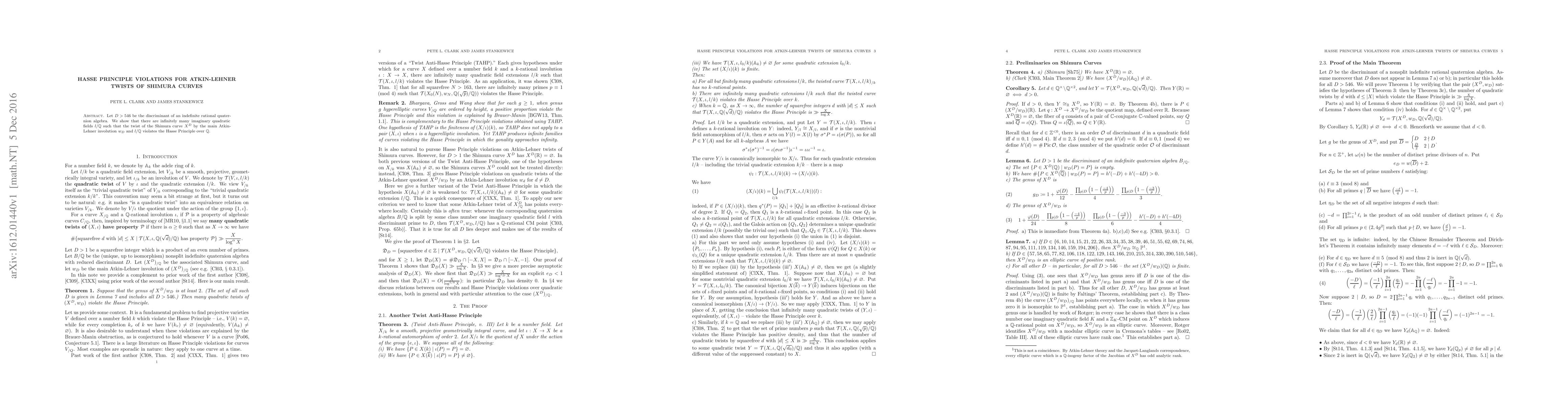This paper demonstrates that for certain Shimura curves twisted by Atkin-Lehner involutions, there exist infinitely many imaginary quadratic fields where the Hasse principle fails over rational numbers. Specifically, it focuses on quaternion algebras with discriminants greater than 546.