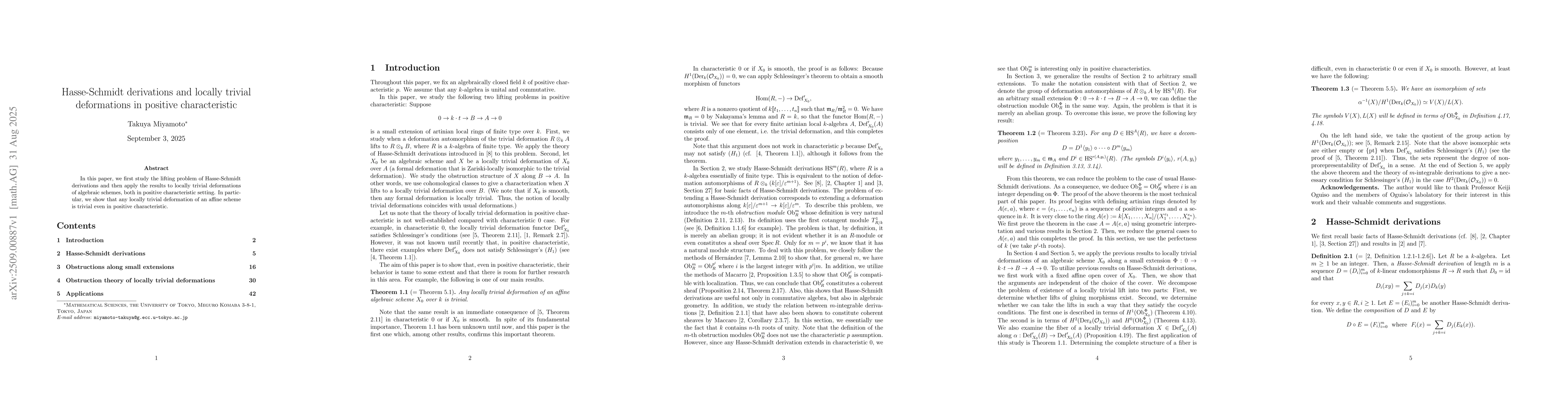 In this paper, we first study the lifting problem of Hasse-Schmidt derivations and then apply the results to locally trivial deformations of algebraic schemes, both in positive characteristic setting. In particular, we show that any locally trivial deformation of an affine scheme is trivial even in positive characteristic.