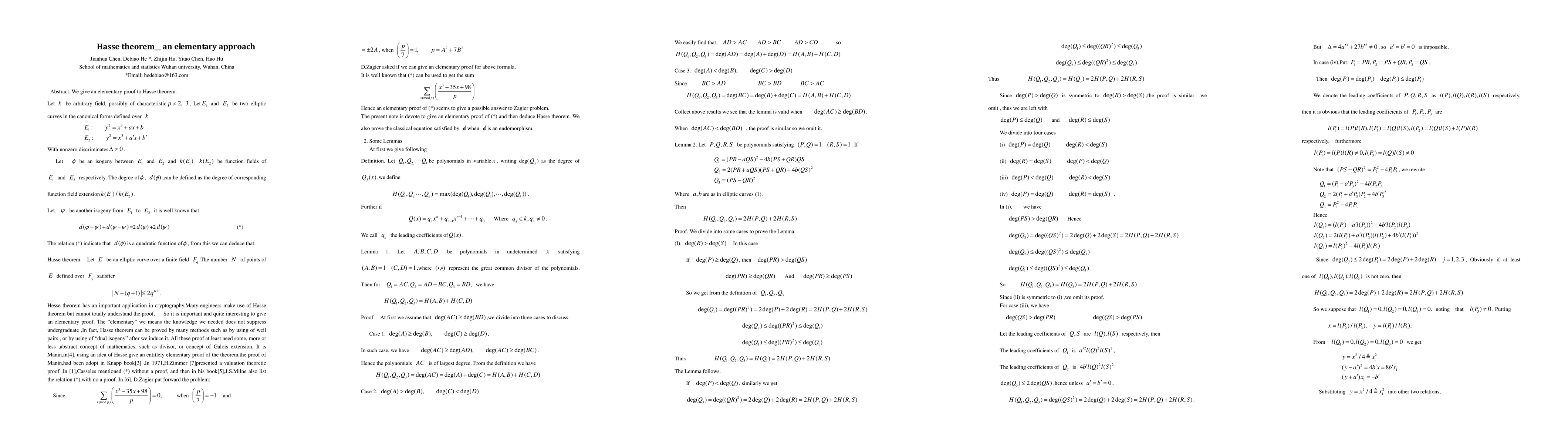 This paper provides an elementary proof of Hasse theorem, a fundamental concept in number theory, using straightforward mathematical reasoning.