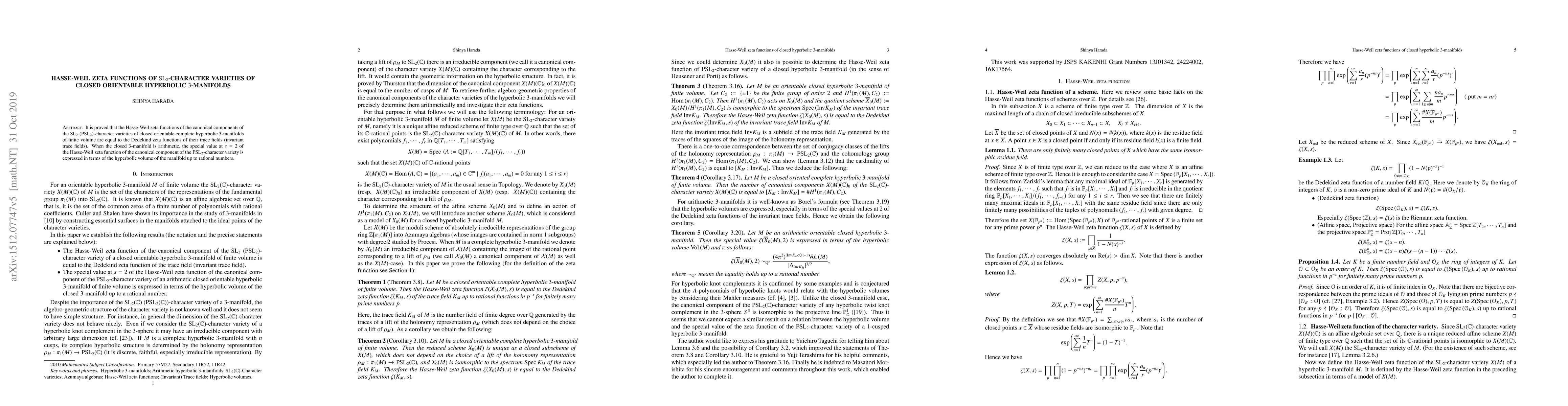 Summary: The paper demonstrates that the Hasse-Weil zeta functions of ${\rm SL}_2$-character varieties for closed orientable hyperbolic $3$-manifolds of finite volume equal the Dedekind zeta functions of their trace fields. For arithmetic manifolds, it links the special value of the zeta function at $s=2$ to the hyperbolic volume of the manifold.