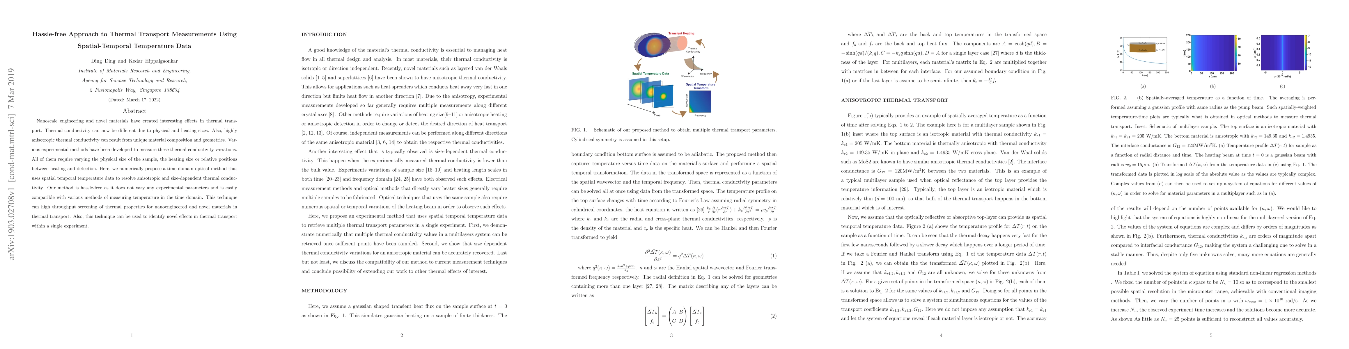 Nanoscale engineering and novel materials have created interesting effects in thermal transport. Thermal conductivity can now be different due to physical and heating sizes. Also, highly anisotropic thermal conductivity can result from unique material composition and geometries. Various experimental methods have been developed to measure these thermal conductivity variations. All of them require varying the physical size of the sample, the heating size or relative positions between heating and detection. Here, we numerically propose a time-domain optical method that uses spatial temporal temperature data to resolve anisotropic and size-dependent thermal conductivity. Our method is hassle-free as it does not vary any experimental parameters and is easily compatible with various methods of measuring temperature in the time domain. This technique can high throughput screening of thermal properties for nanoengineered and novel materials in thermal transport. Also, this technique can be used to identify novel effects in thermal transport within a single experiment.