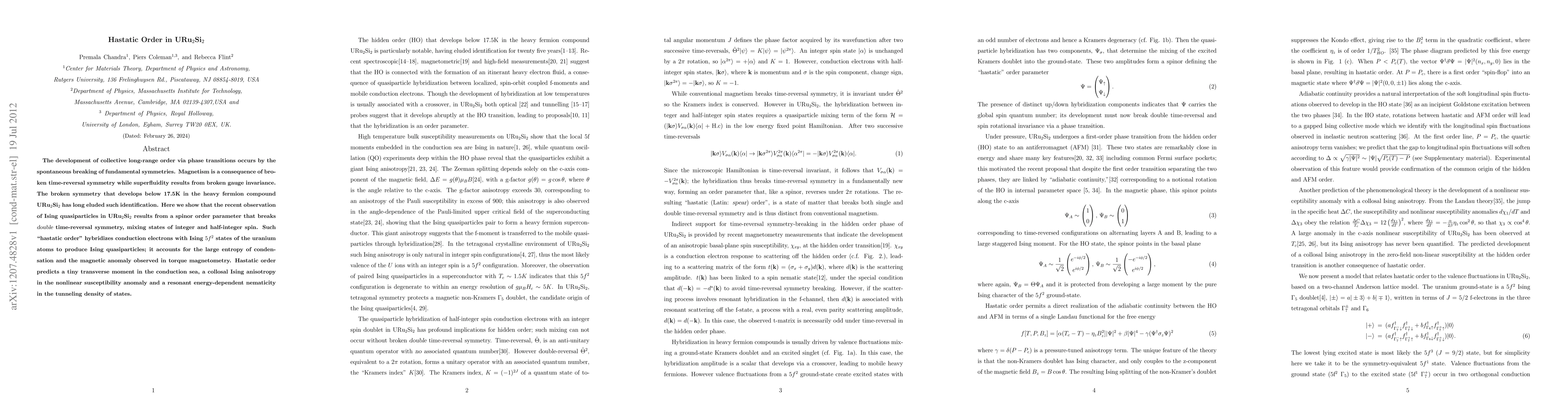 A new type of order called hastatic order is found in URu2Si2, breaking double time-reversal symmetry and creating Ising quasiparticles that explain the compound's unique magnetic behavior.