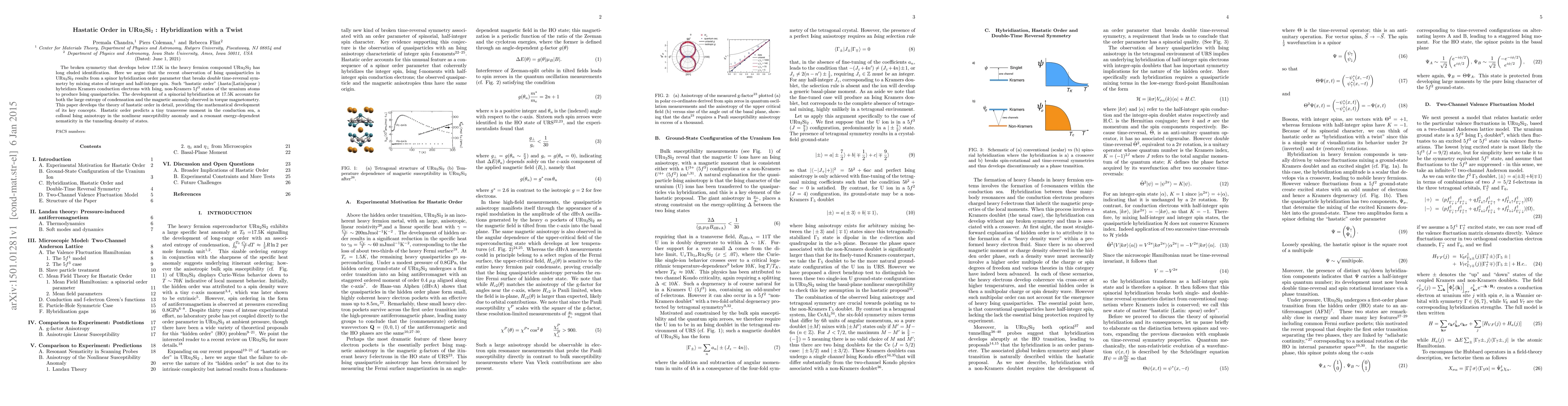 The paper introduces and develops the concept of hastatic order, a novel mechanism for explaining the broken symmetry below 17.5K in URu2Si2, involving a spinor hybridization order parameter.