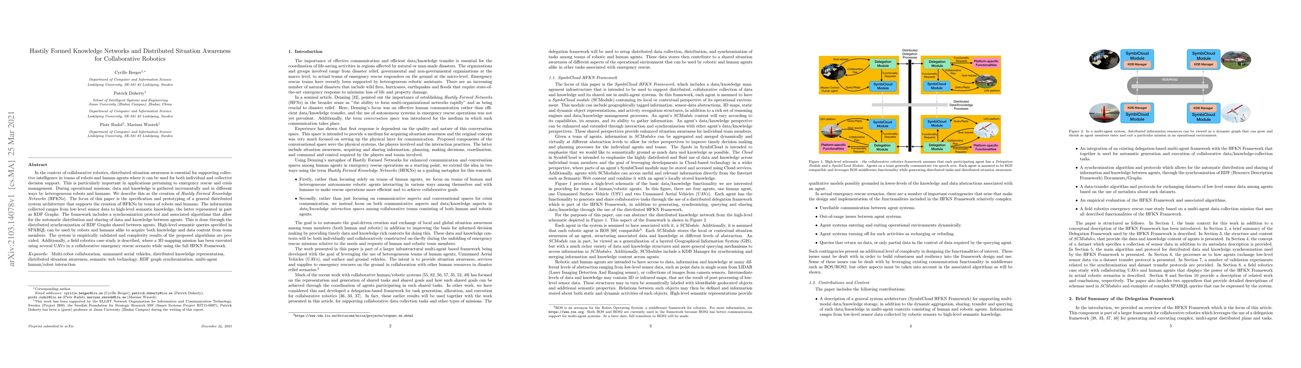 In the context of collaborative robotics, distributed situation awareness is essential for supporting collective intelligence in teams of robots and human agents where it can be used for both individual and collective decision support. This is particularly important in applications pertaining to emergency rescue and crisis management. During operational missions, data and knowledge is gathered incrementally and in different ways by heterogeneous robots and humans. We describe this as the creation of \emph{Hastily Formed Knowledge Networks} (HFKNs). The focus of this paper is the specification and prototyping of a general distributed system architecture that supports the creation of HFKNs by teams of robots and humans. The information collected ranges from low-level sensor data to high-level semantic knowledge, the latter represented in part as RDF Graphs. The framework includes a synchronization protocol and associated algorithms that allow for the automatic distribution and sharing of data and knowledge between agents. This is done through the distributed synchronization of RDF Graphs shared between agents. High-level semantic queries specified in SPARQL can be used by robots and humans alike to acquire both knowledge and data content from team members. The system is empirically validated and complexity results of the proposed algorithms are provided. Additionally, a field robotics case study is described, where a 3D mapping mission has been executed using several UAVs in a collaborative emergency rescue scenario while using the full HFKN Framework.