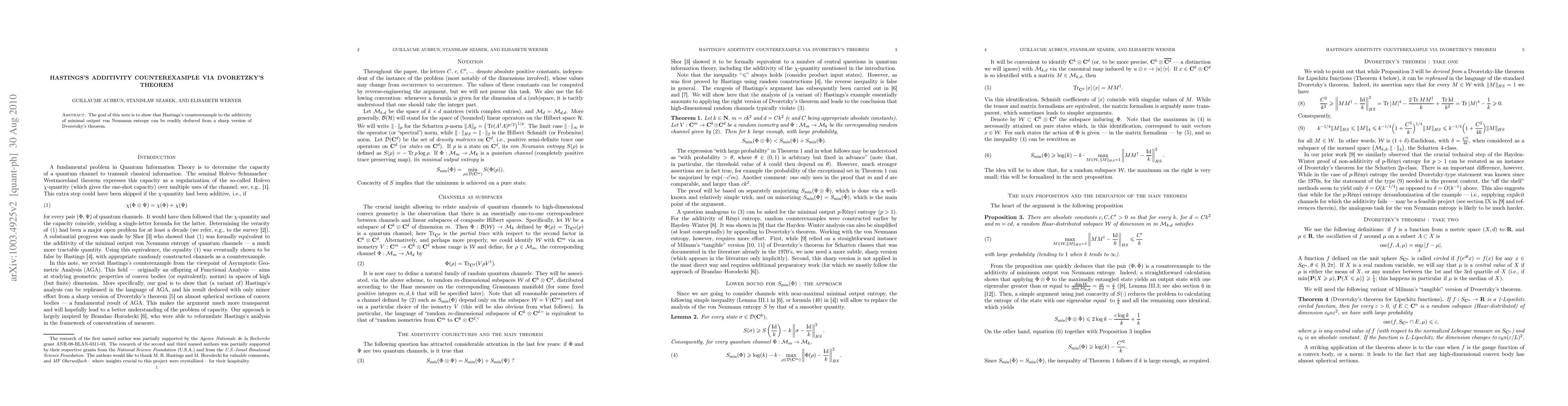 This paper demonstrates that Hastings' counterexample to the additivity of minimal output von Neumann entropy can be derived using a refined version of Dvoretzky's theorem on almost spherical sections of convex bodies. The result highlights the intricate connection between information theory and geometric properties of convex sets.