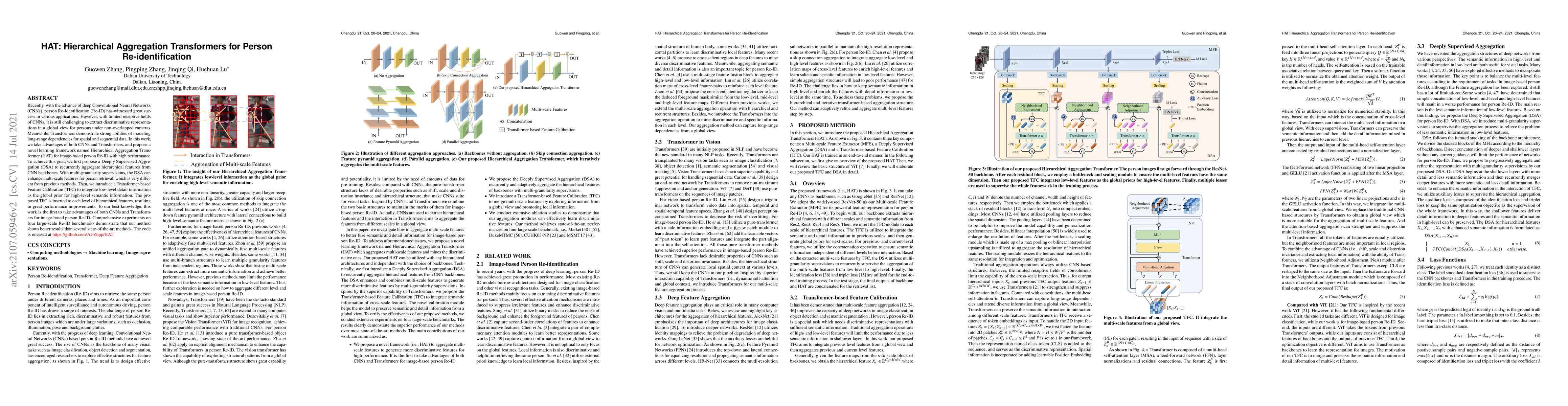 The paper proposes a Hierarchical Aggregation Transformer (HAT) framework that combines Convolutional Neural Networks (CNNs) and Transformers to enhance person re-identification performance. It utilizes Deeply Supervised Aggregation (DSA) for hierarchical feature enhancement and Transformer-based Feature Calibration (TFC) to integrate global context, achieving superior results on multiple benchmarks.