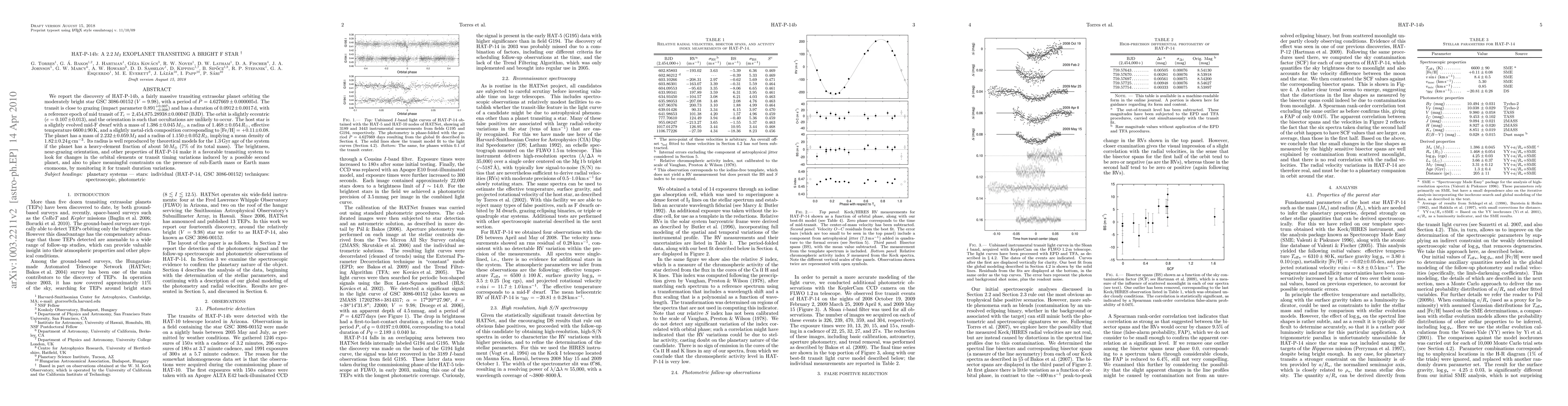 HAT-P-14b is a 2.2 Jupiter-mass exoplanet transiting a bright F star with a period of 4.63 days. Its near-grazing transit and slightly eccentric orbit make it an ideal candidate for studying potential second planets or exomoons.