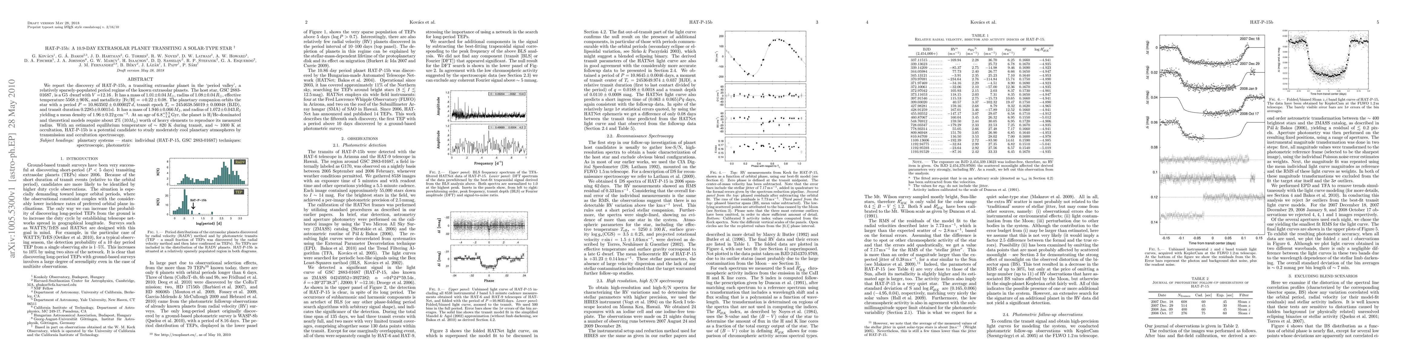 We report the discovery of HAT-P-15b, a transiting extrasolar planet in the `period valley', a relatively sparsely-populated period regime of the known extrasolar planets. The host star, GSC 2883-01687, is a G5 dwarf with V=12.16. It has a mass of 1.01+/-0.04 M(Sun), radius of 1.08+/-0.04 R(Sun), effective temperature 5568+/-90 K, and metallicity [Fe/H] = +0.22+/-0.08. The planetary companion orbits the star with a period 10.863502+/-0.000027 days, transit epoch Tc = 2454638.56019+/-0.00048 (BJD), and transit duration 0.2285+/-0.0015 days. It has a mass of 1.946+/-0.066 M(Jup), and radius of 1.072+/-0.043 R(Jup) yielding a mean density of 1.96+/-0.22 g/cm3. At an age of 6.8+/-2.1 Gyr, the planet is H/He-dominated and theoretical models require about 2% (10 M(Earth)) worth of heavy elements to reproduce its measured radius. With an estimated equilibrium temperature of 820 K during transit, and 1000 K at occultation, HAT-P-15b is a potential candidate to study moderately cool planetary atmospheres by transmission and occultation spectroscopy.