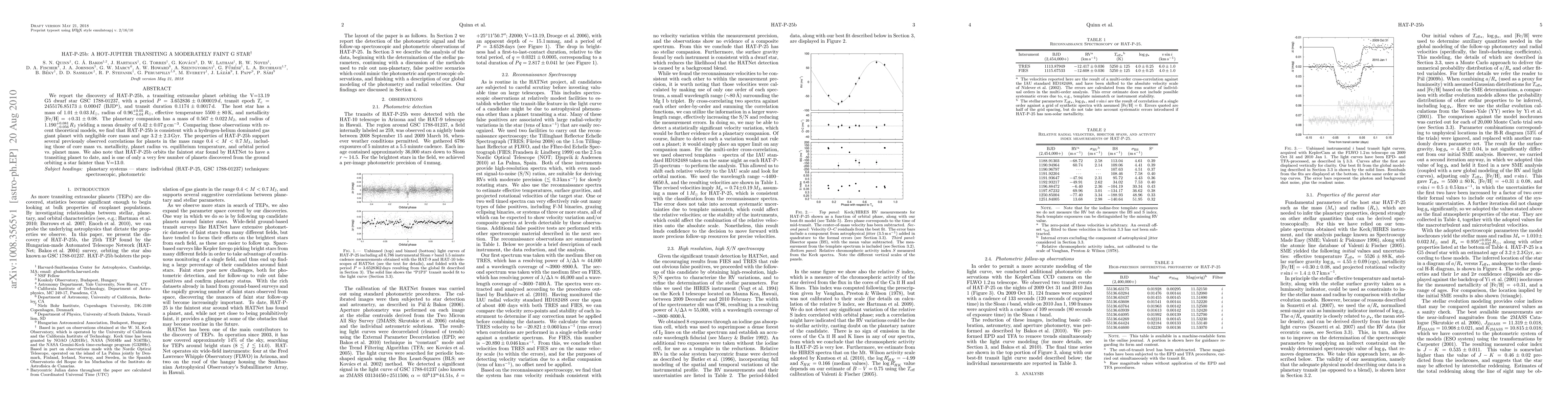 HAT-P-25b is a transiting hot Jupiter orbiting a moderately faint G5 star, discovered with a period of 3.65 days. The planet has a mass and radius consistent with a hydrogen-helium gas giant, supporting observed correlations for similar-mass planets.